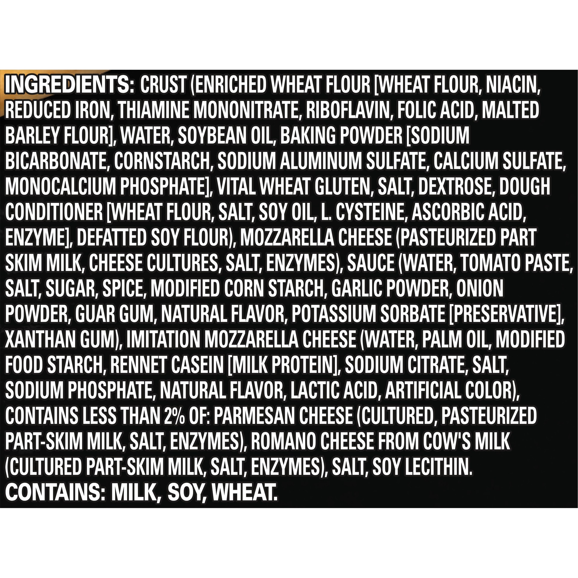 Crust (Enriched Wheat Flour [Wheat Flour, Niacin, Reduced Iron, Thiamine Mononitrate, Riboflavin, Folic Acid], Malted Barley Flour], Water, Soybean Oil, Baking Powder [Sodium Bicarbonate, Cornstarch, …