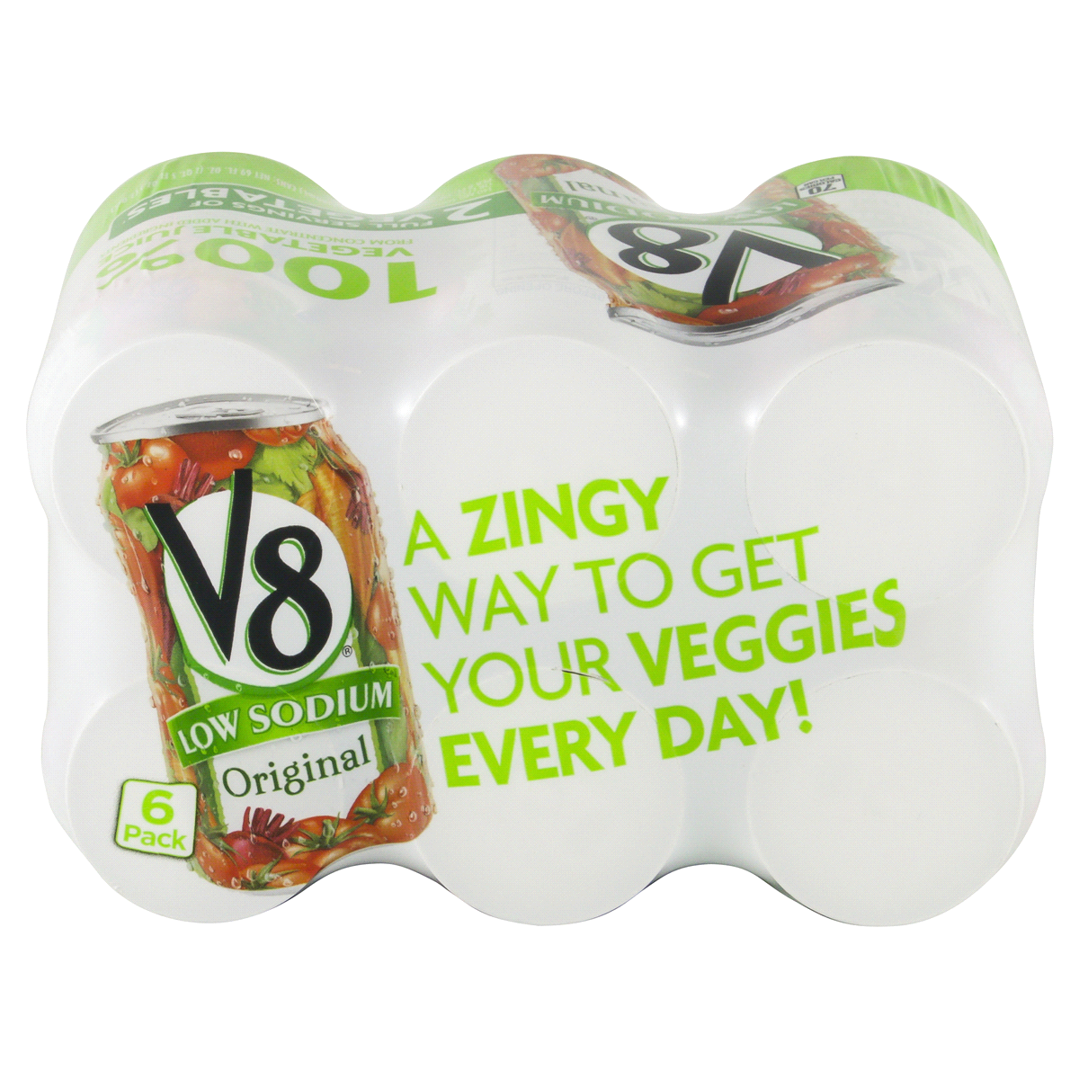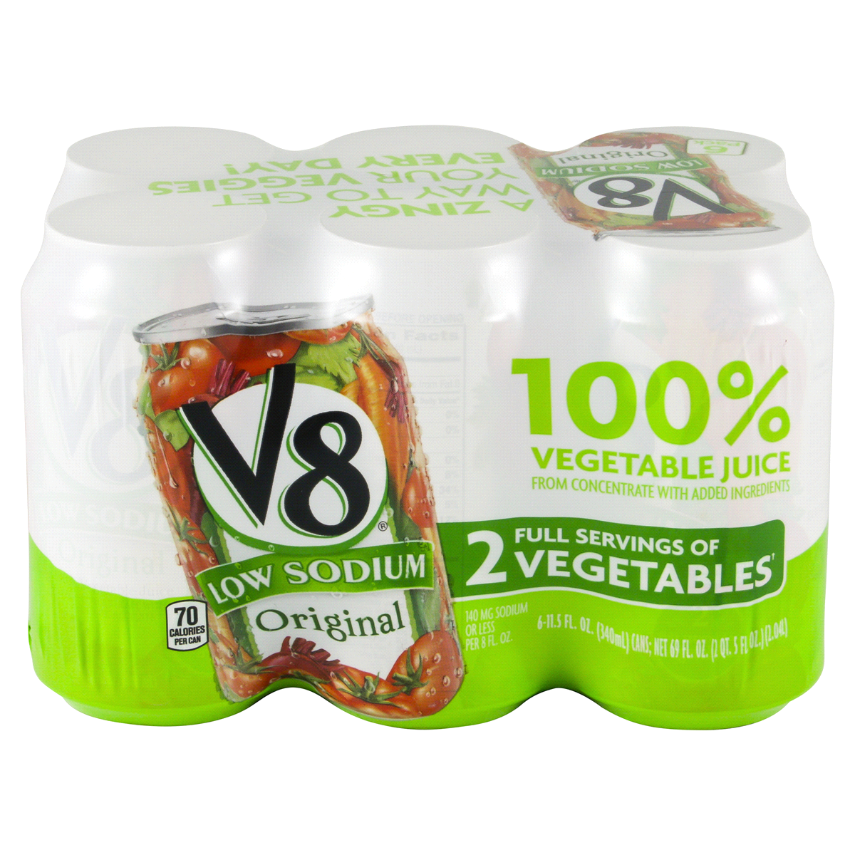 - Six (6) 11.5 fl oz single-serve cans of V8 Low Sodium Original 100% Vegetable Juice