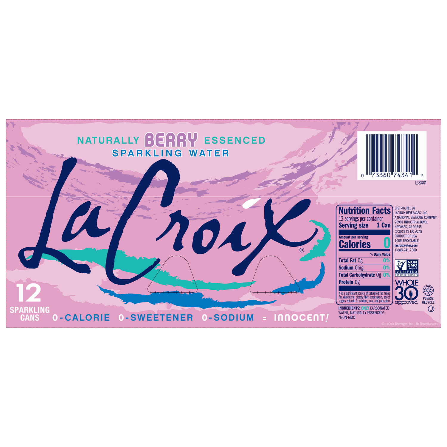100% natural berry flavored Sparkling Water. Water. Calorie free. Sweetener free. Sodium free. Calorie; sweetener; sodium free. Consumer information call 1-888-241-7360. www.lacroixwater.com. 100% rec…