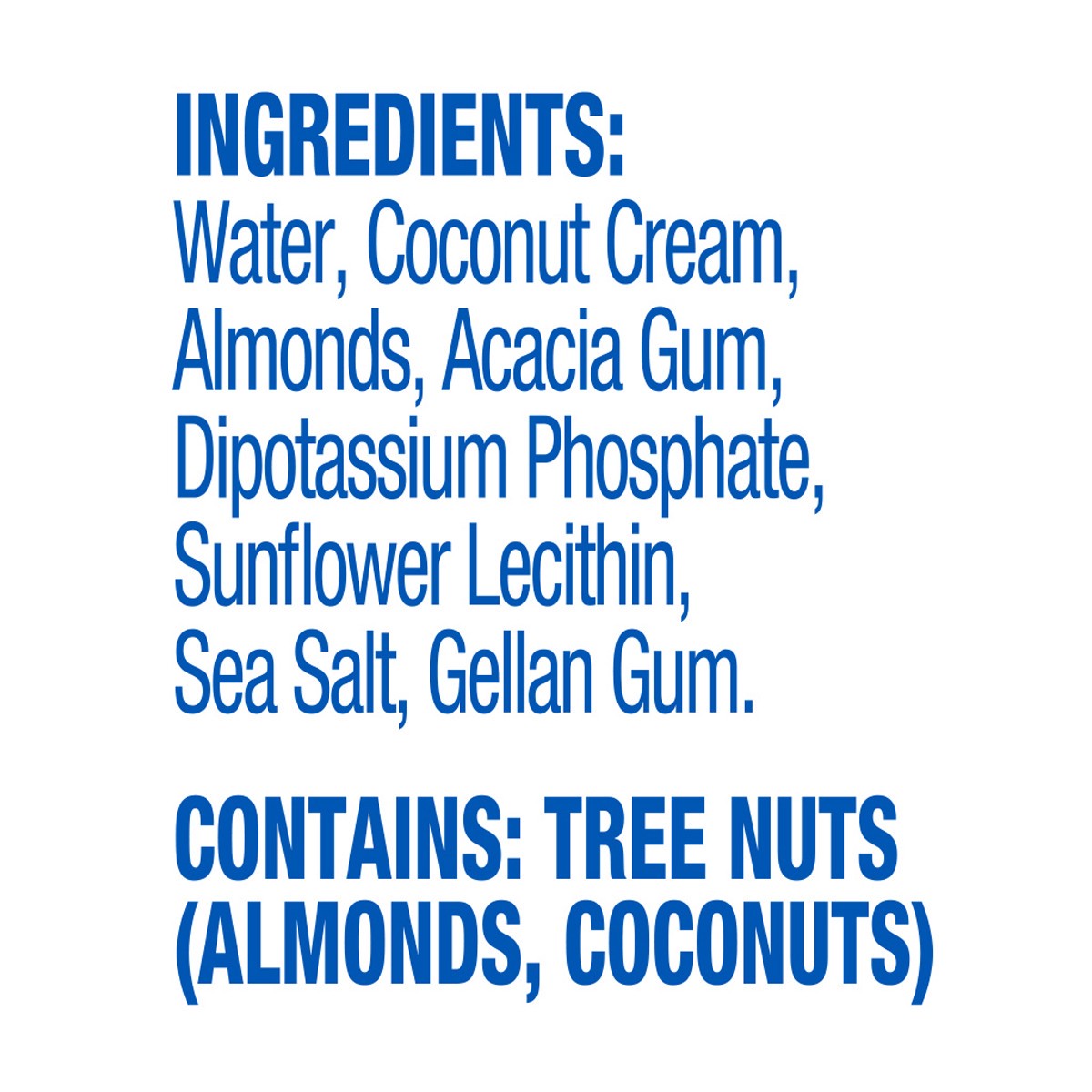Water, Coconut Cream, Almonds, Acacia Gum, Dipotassium Phosphate, Sunflower Lecithin, Sea Salt, Gellan Gum.