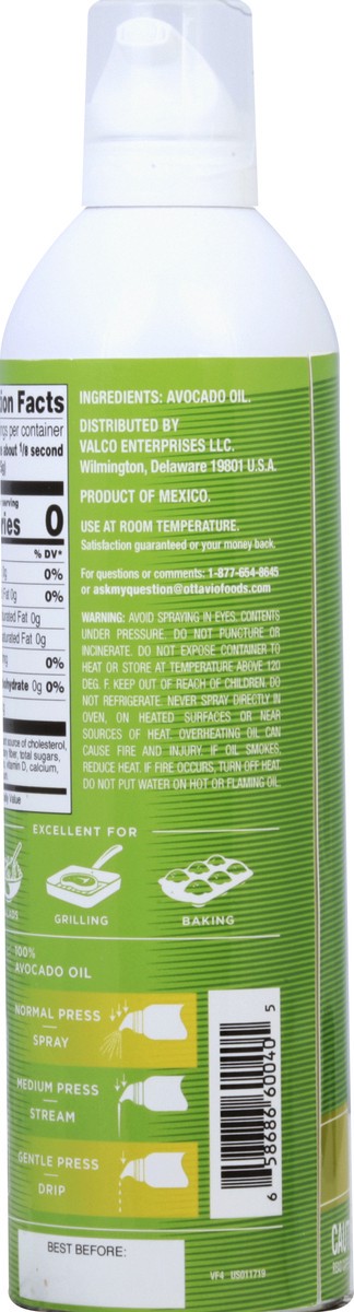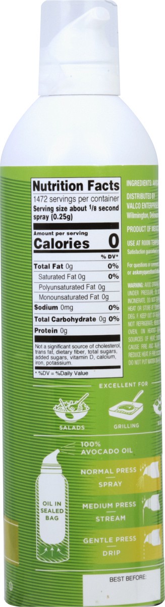 Mild taste. Propellant-free oil. Oil in sealed bag. Satisfaction guaranteed or your money back. For questions or comments: 1-877-654-8645. Product of Mexico.