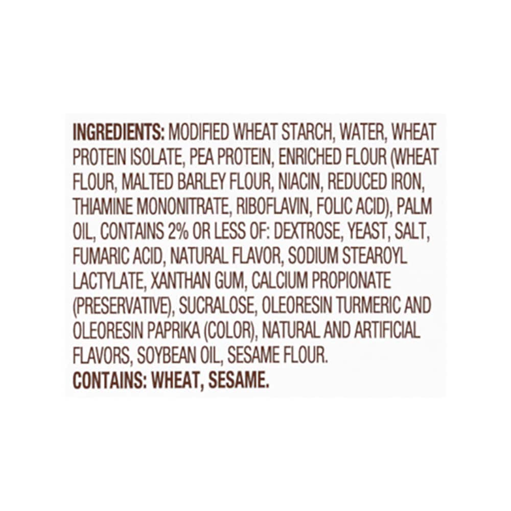 Modified Wheat Starch, Water, Wheat Protein Isolate, Pea Protein, Wheat Flour, Palm Oil, Contains 2% Or Less Of: Dextrose, Yeast, Salt, Fumaric Acid, Natural Flavor, Sodium Stearoyl Lactylate, Xanthan…