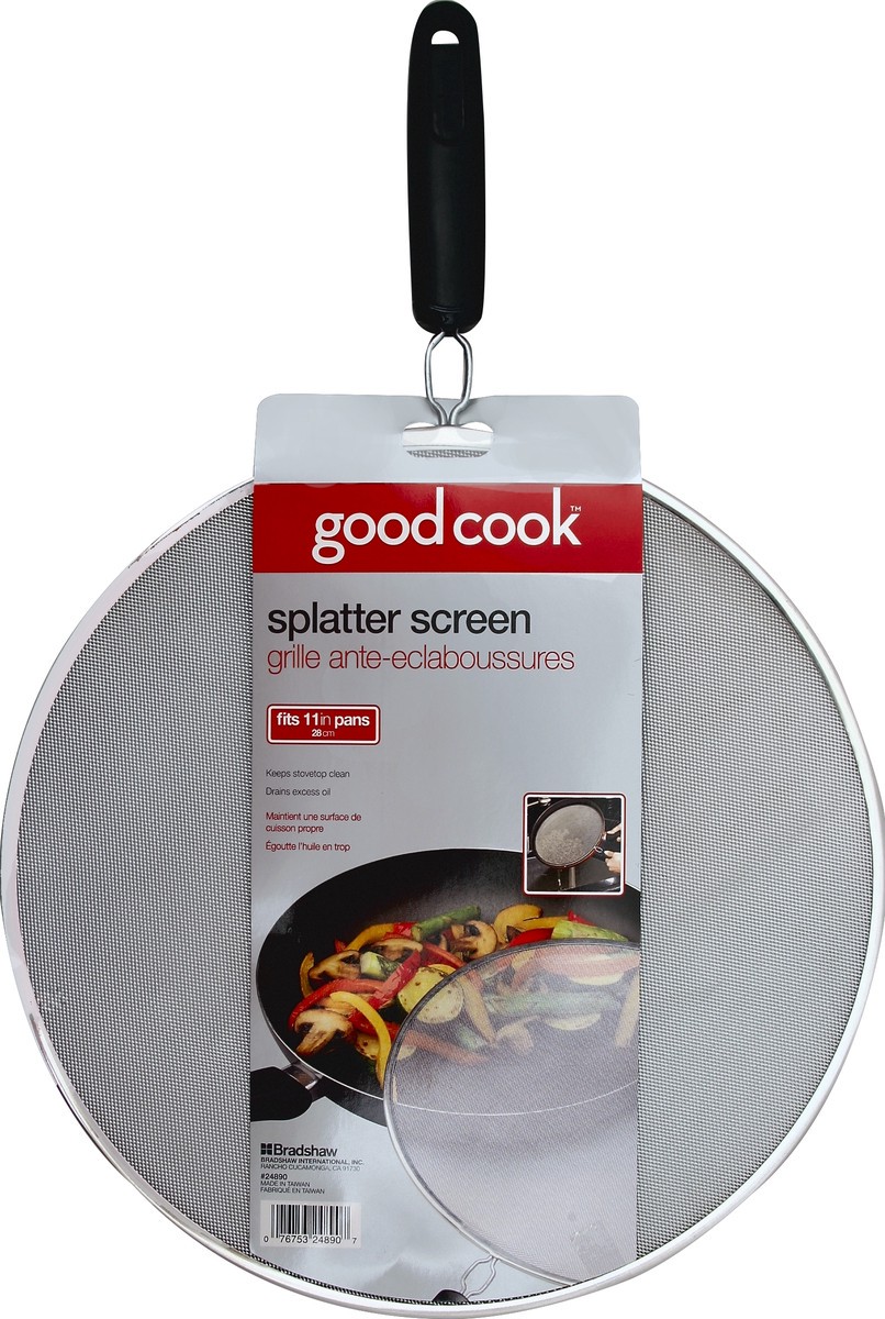 Fits 11 inch pans. Keeps stovetop clean. Drains excess oil. 100% satisfaction guarantee. www.goodcook.com. Made in Taiwan.