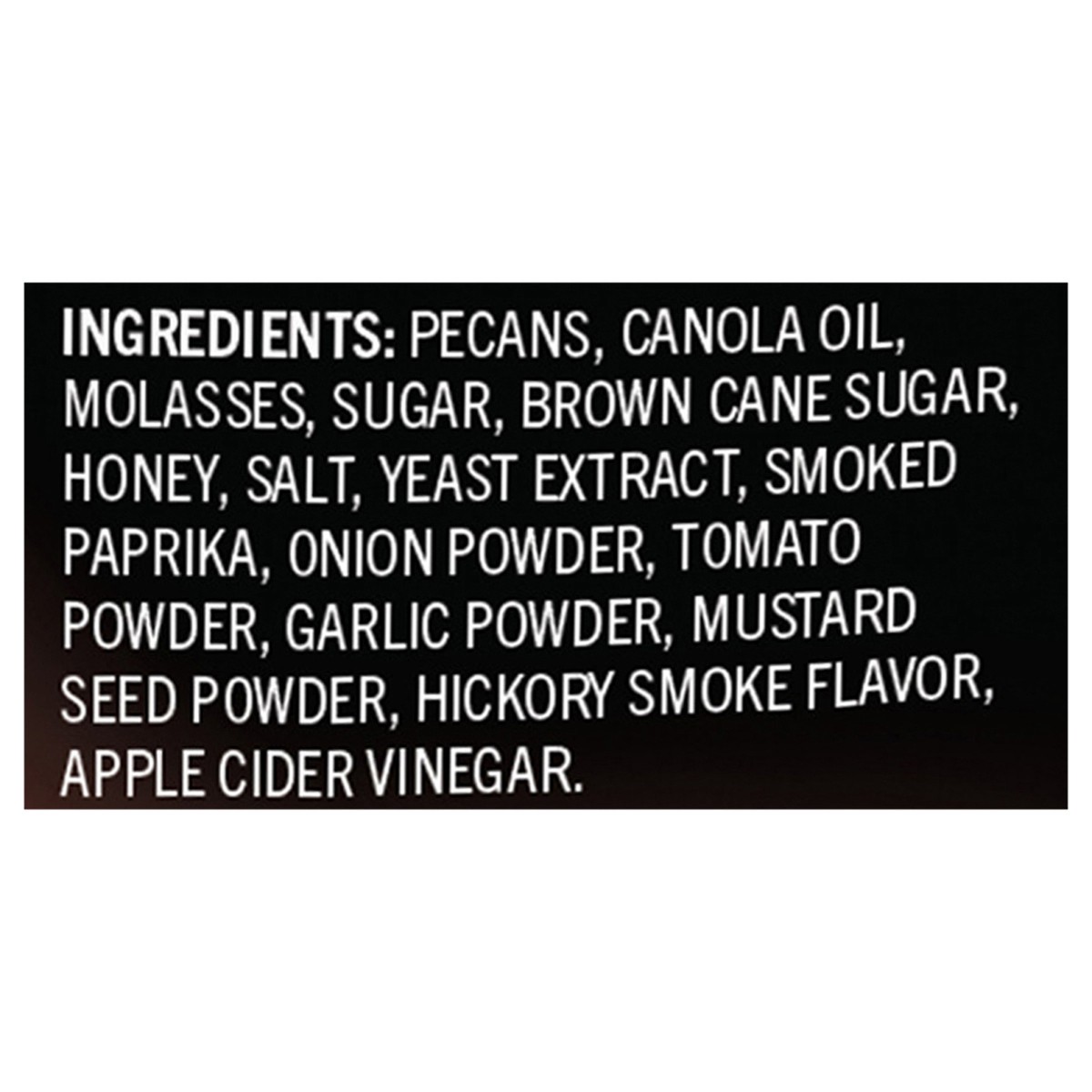 Pecans, Canola Oil, Molasses, Sugar, Brown Cane Sugar, Honey, Salt, Yeast Extract, Smoked Paprika, Onion Powder, Tomato Powder, Garlic Powder, Mustard Seed Powder, Hickory Smoke Flavor, Apple Cider Vi…