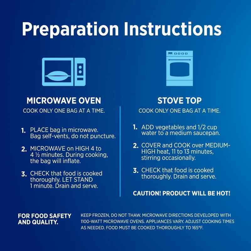 - Quick prep: microwave in the bag or heat on the stovetop