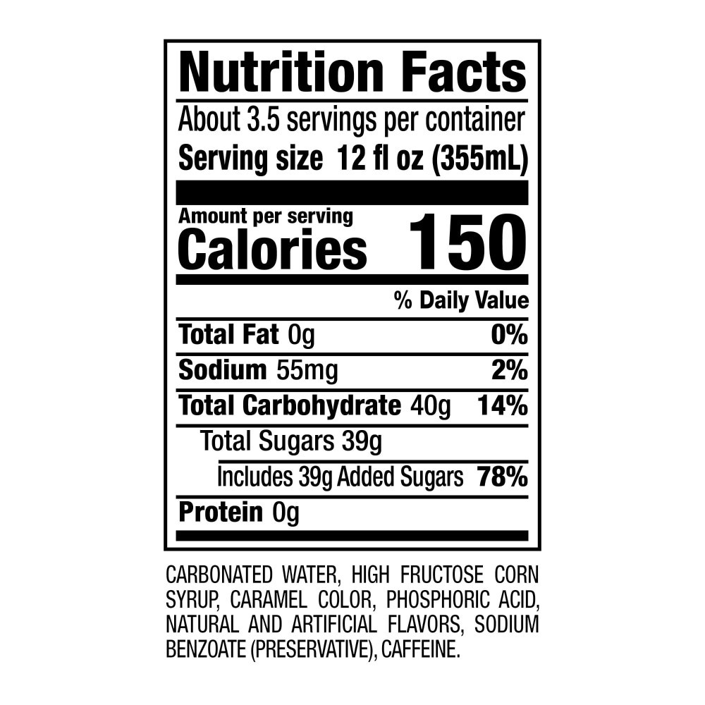 Carbonated Water, High Fructose Corn Syrup, Caramel Color, Phosphoric Acid, Natural and Artificial Flavors, Sodium Benzoate (Preservative), Caffeine.