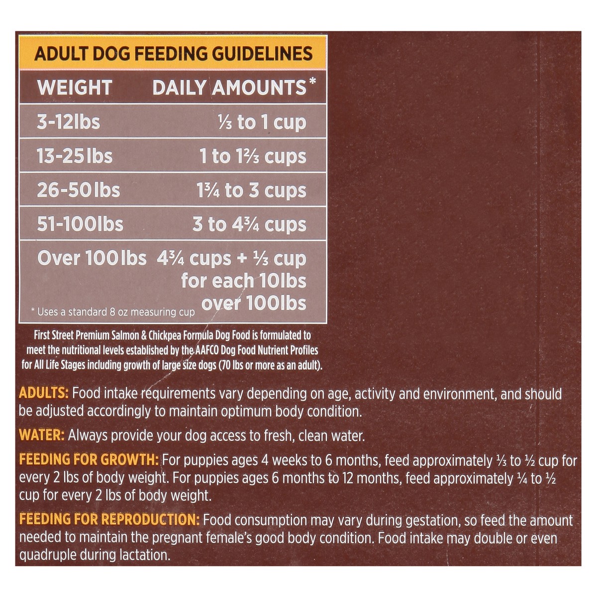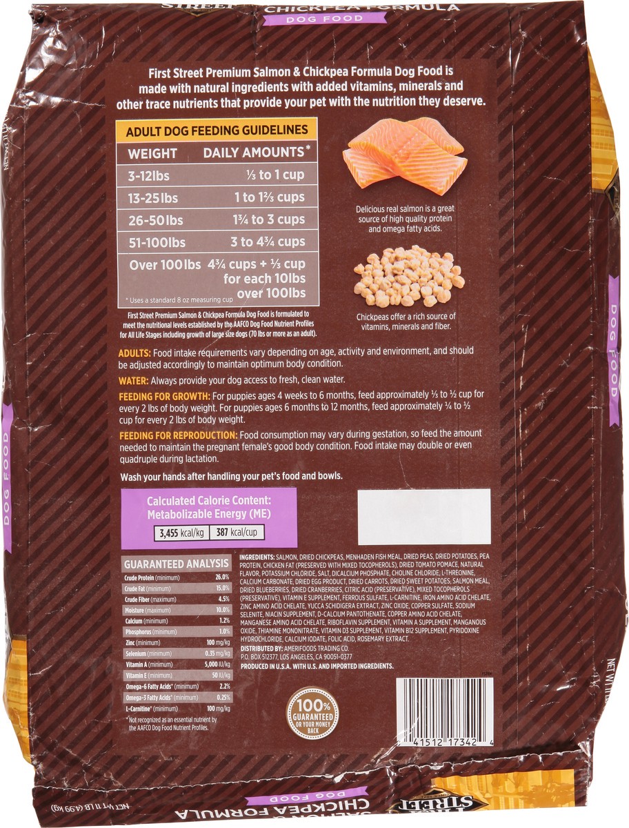 Calculated Calorie Content: Metabolizable Energy (ME) 3,455 kcal/kg; 387 kcal/cup First Street Premium Salmon & Chickpea Formula Dog Food is formulated to meet the nutritional levels established by th…
