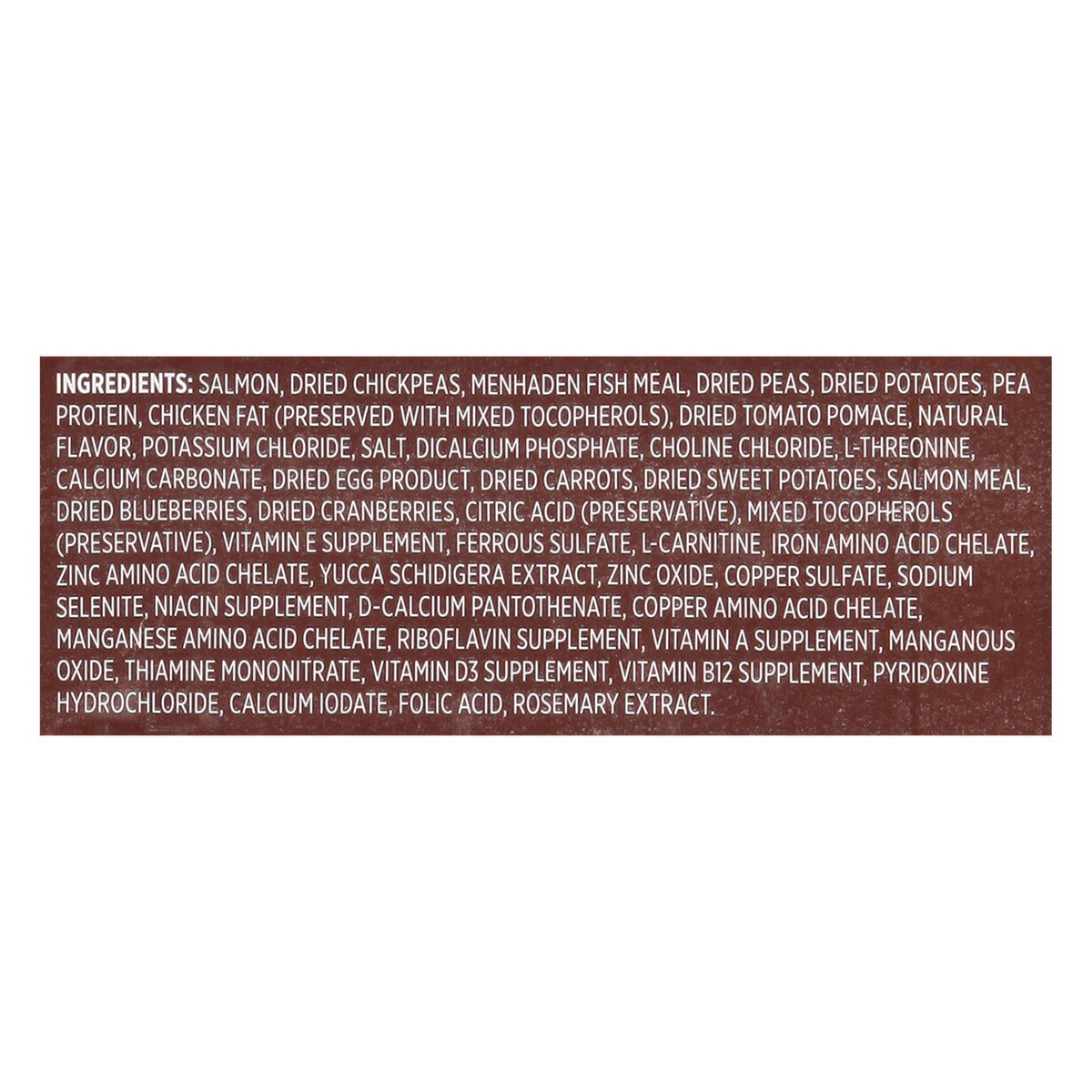 Salmon, Dried Chickpeas, Menhaden Fish Meal, Dried Peas, Dried Potatoes, Pea Protein, Chicken Fat (Preserved with Mixed Tocopherols), Dried Tomato Pomace, Natural Flavor, Potassium Chloride, Salt, Dic…