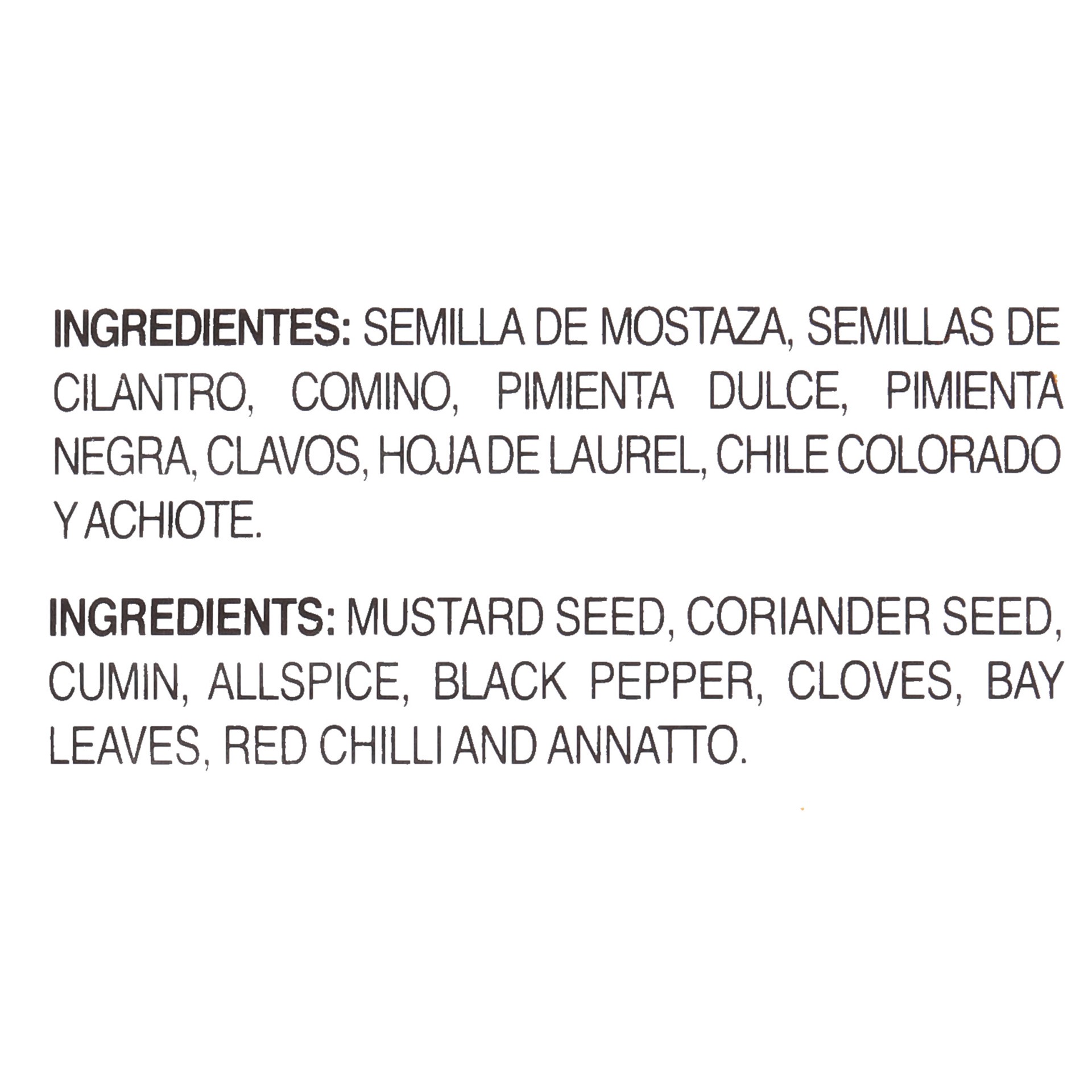 Mustard Seed, Coriander Seed, Cumin, Allspice, Black Pepper, Cloves, Bay Leaves, Red Chilli and Annatto.