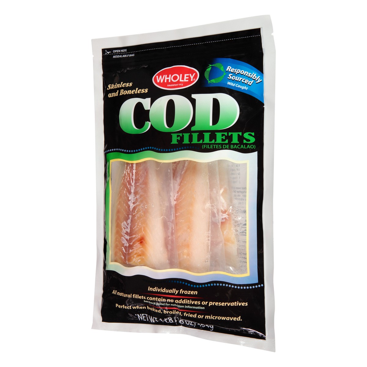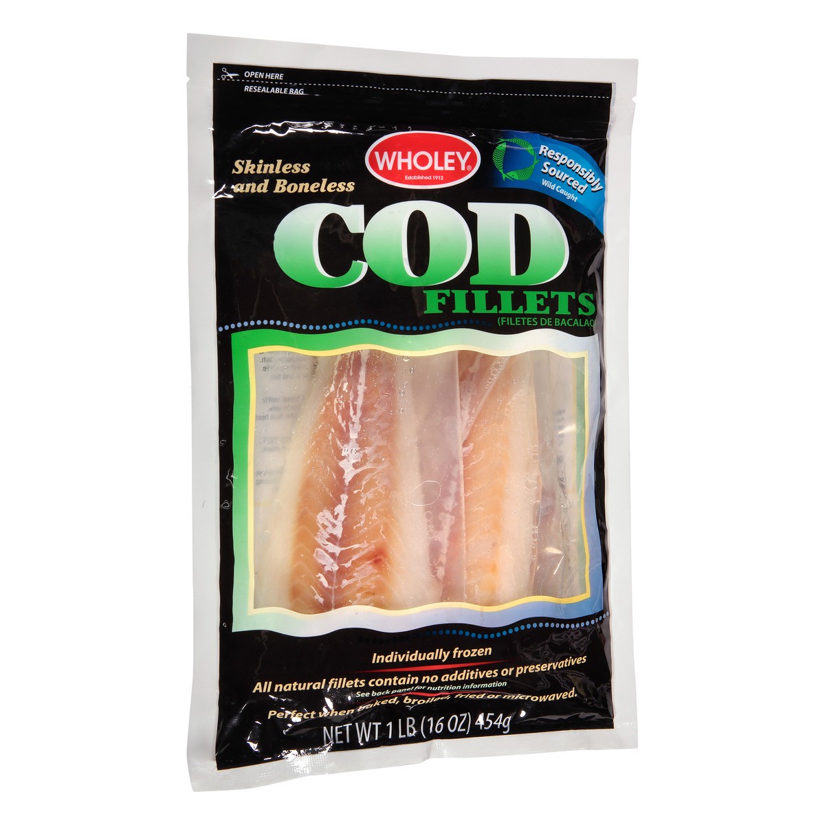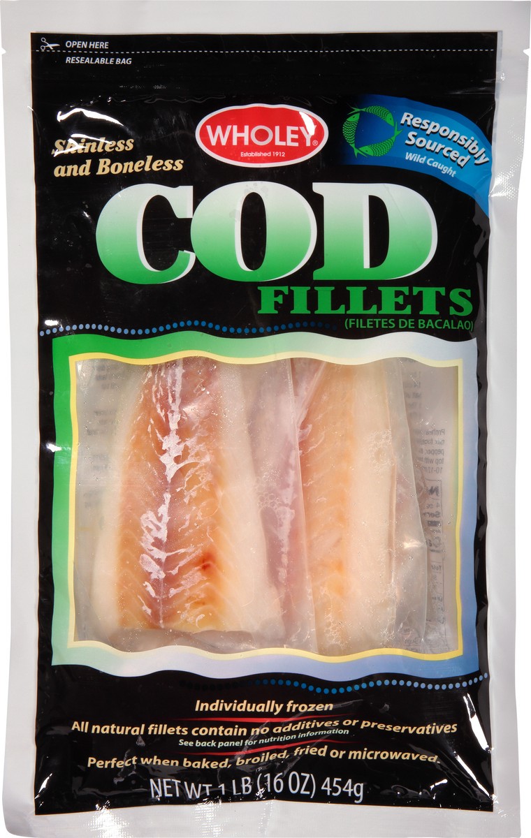 See back panel for nutrition. Wild caught. Established 1912. Wholey Cod Fillets are delicious when prepared with your favorite seafood recipe or simply bake, broil fry, or microwave for a quick and ea…