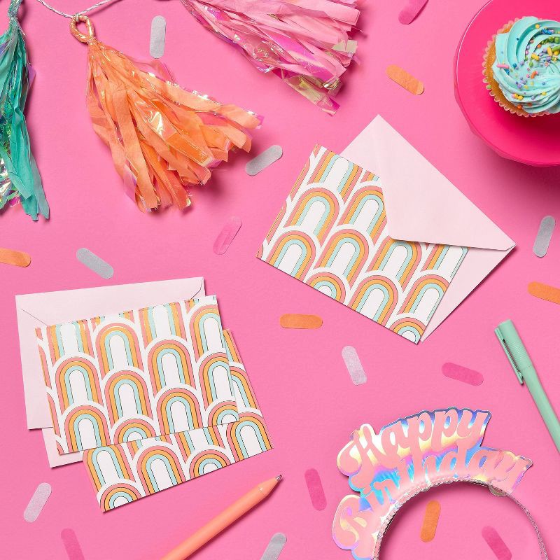 Express your thoughts or emotions using this 24ct Feminine Rainbow notecards from Spritz™. Share a warm thank you or any other message with these cards. The pink note card along with the rainbow desig…