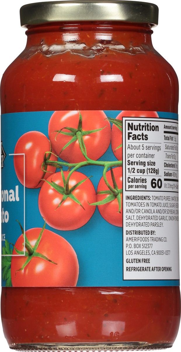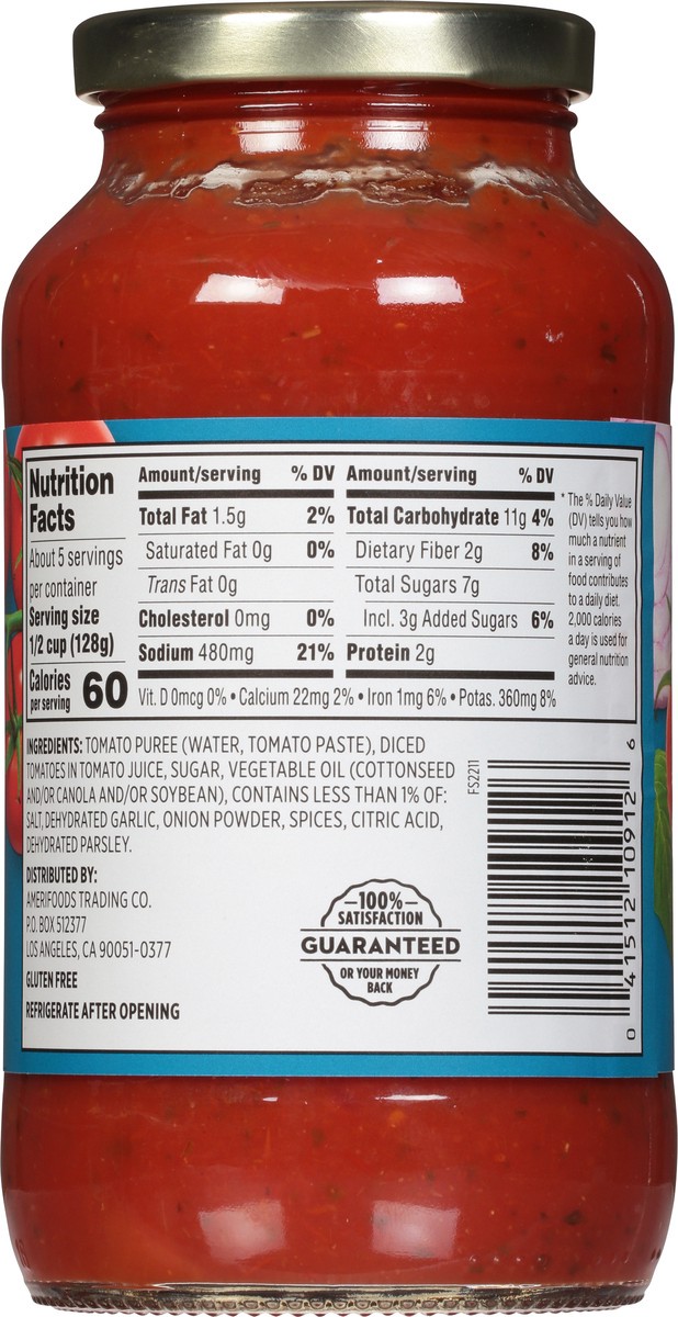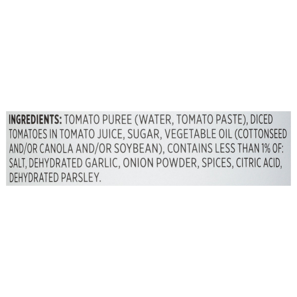 Tomato Puree (Water, Tomato Paste), Diced Tomatoes in Tomato Juice, Sugar, Vegetable Oil (Cottonseed and/or Canola and/or Soybean), Contains Less than 1% of: Salt, Dehydrated Garlic, Onion Powder, Spi…