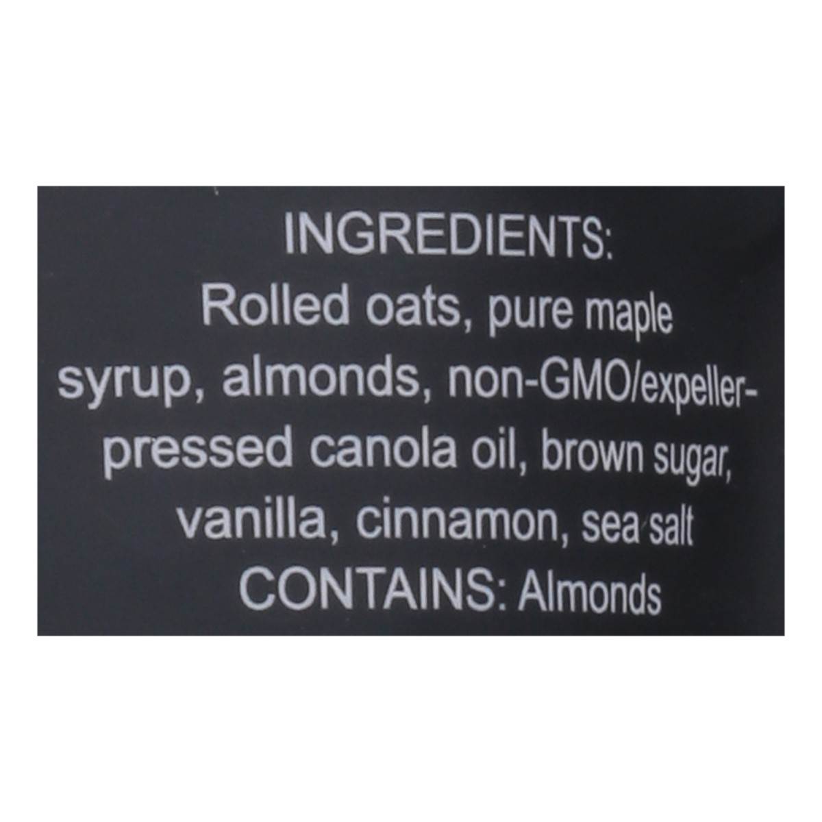 Rolled Oats, Pure Maple Syrup, Almonds, Non-GMO/Expeller Pressed Canola Oil, Brown Sugar, Vanilla, Cinnamon, Sea Salt.