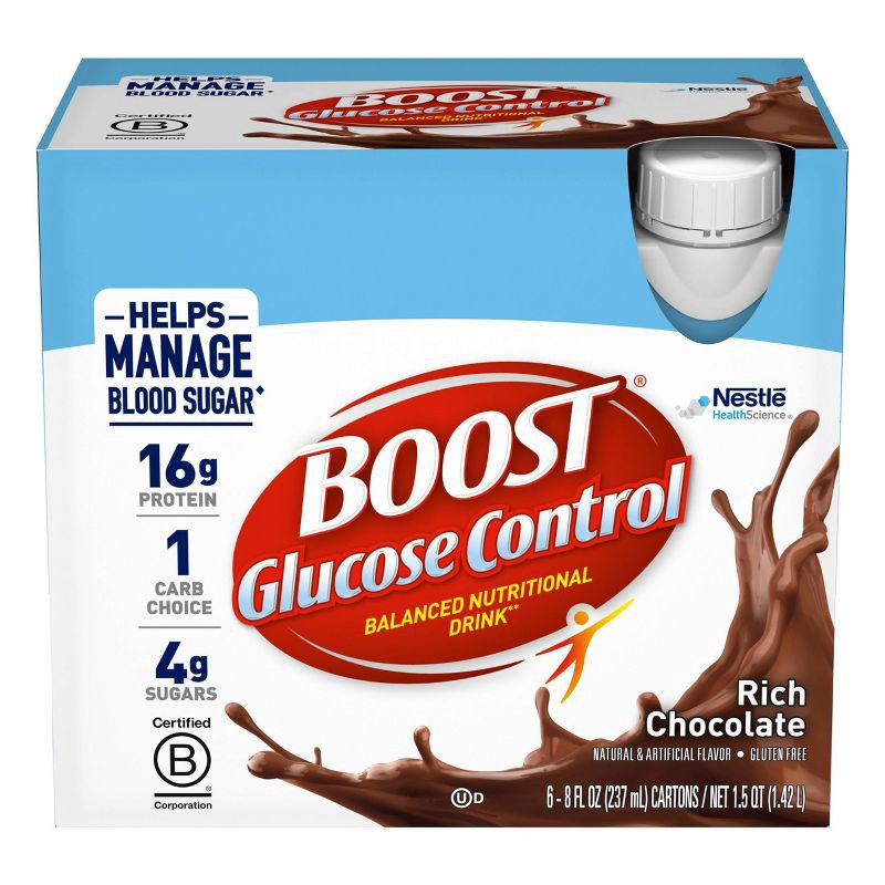 - Six 8 fl oz cartons of BOOST Glucose Control Rich Chocolate Nutritional Drink