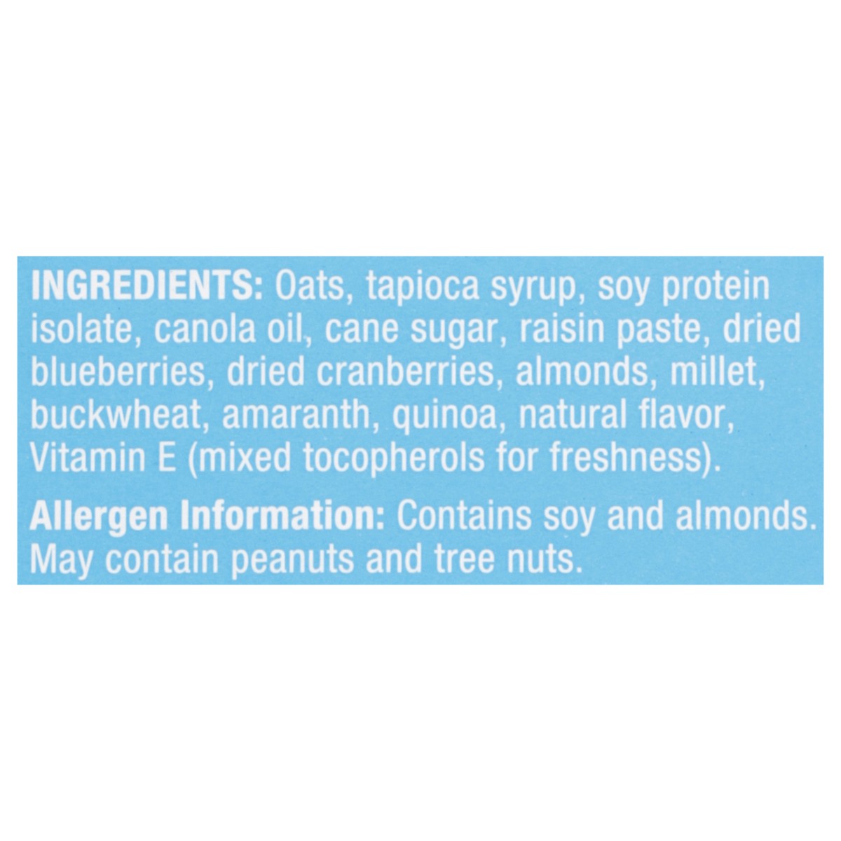 Oats, Tapioca Syrup, Soy Protein Isolate, Canola Oil, Cane Sugar, Raisin Paste, Dried Blueberries, Dried Cranberries, Almonds, Millet, Buckwheat, Amaranth, Quinoa, Natural Flavor, Vitamin E (Mixed Toc…