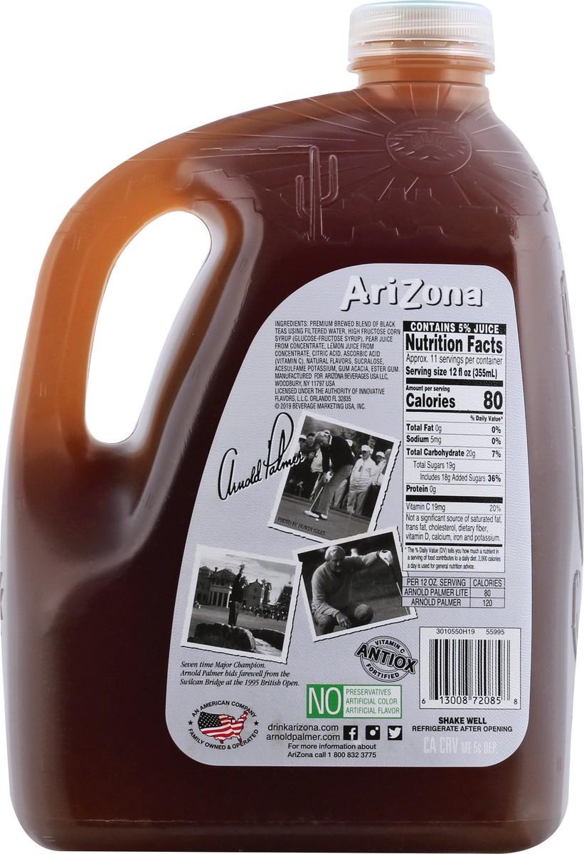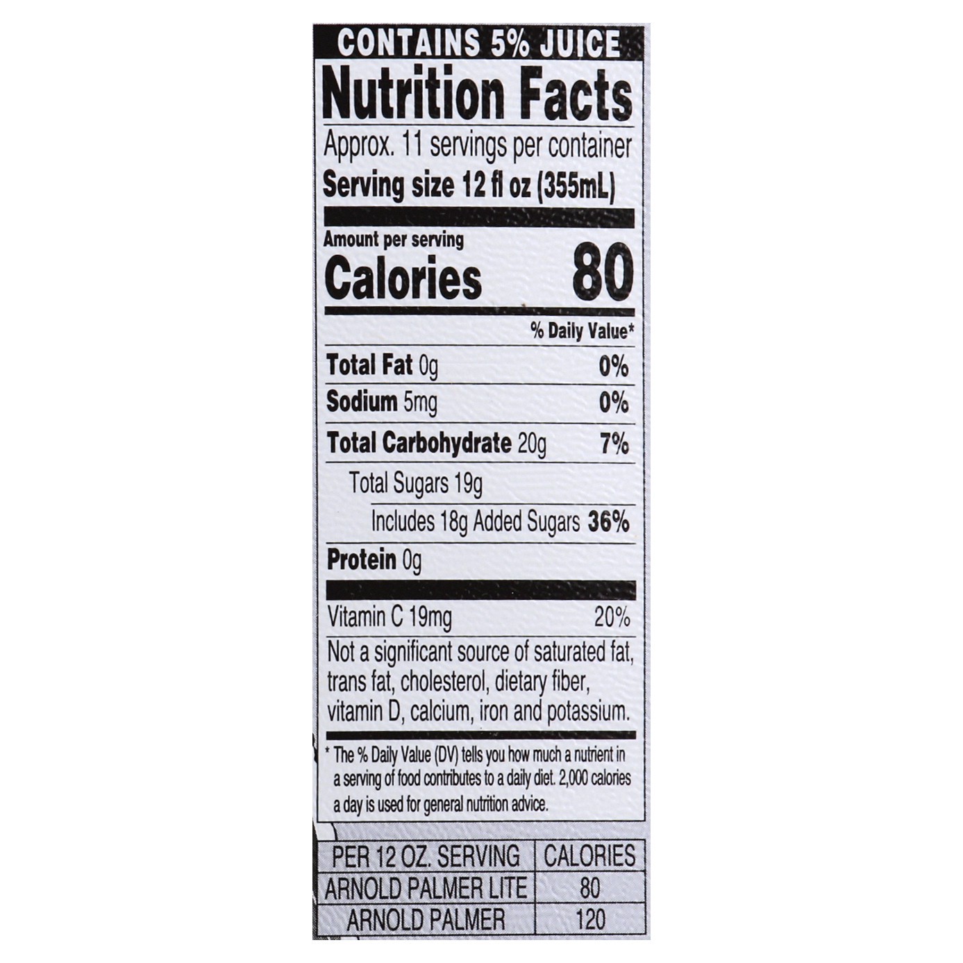 No artificial flavor. 1/3 less calories than Arnold Palmer. Per 12 oz. Serving: Arnold Palmer Lite: 80 calories. Arnold Palmer: 120 calories. Antiox: Vitamin C fortified. Seven major champion Arnold P…