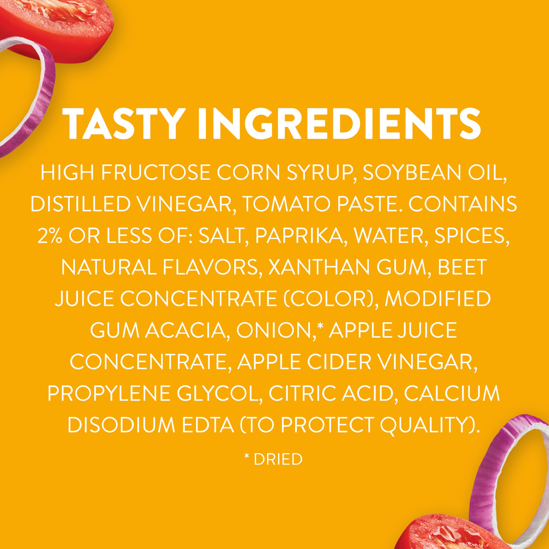 High Fructose Corn Syrup, Soybean Oil, Distilled Vinegar, Tomato Paste. Contains 2% or Less of: Salt, Paprika, Water, Spices, Natural Flavors, Xanthan Gum, Beet Juice Concentrate (Color), Modified Gum…