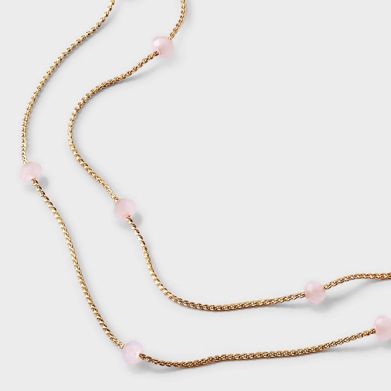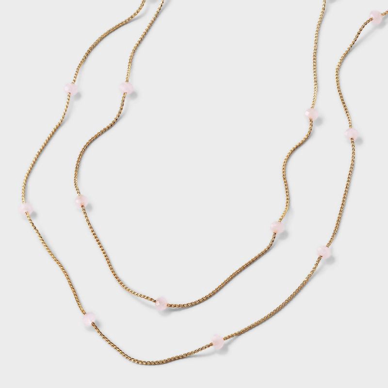 Freshen up your jewelry assortment with this Two-Row Pearl Necklace from A New Day™. This 16-inch double-layered necklace features classic gold-tone cable chains adorned with light pink faux-pearl bea…