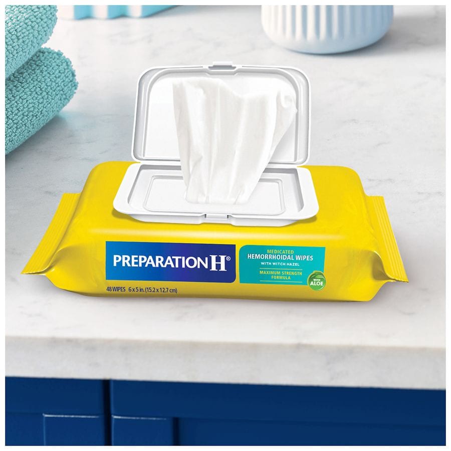 PREPARATION H Flushable Medicated Hemorrhoid Wipes, Maximum Strength Relief with Witch Hazel, Pouch (2 x 48 Count, 96 Count)