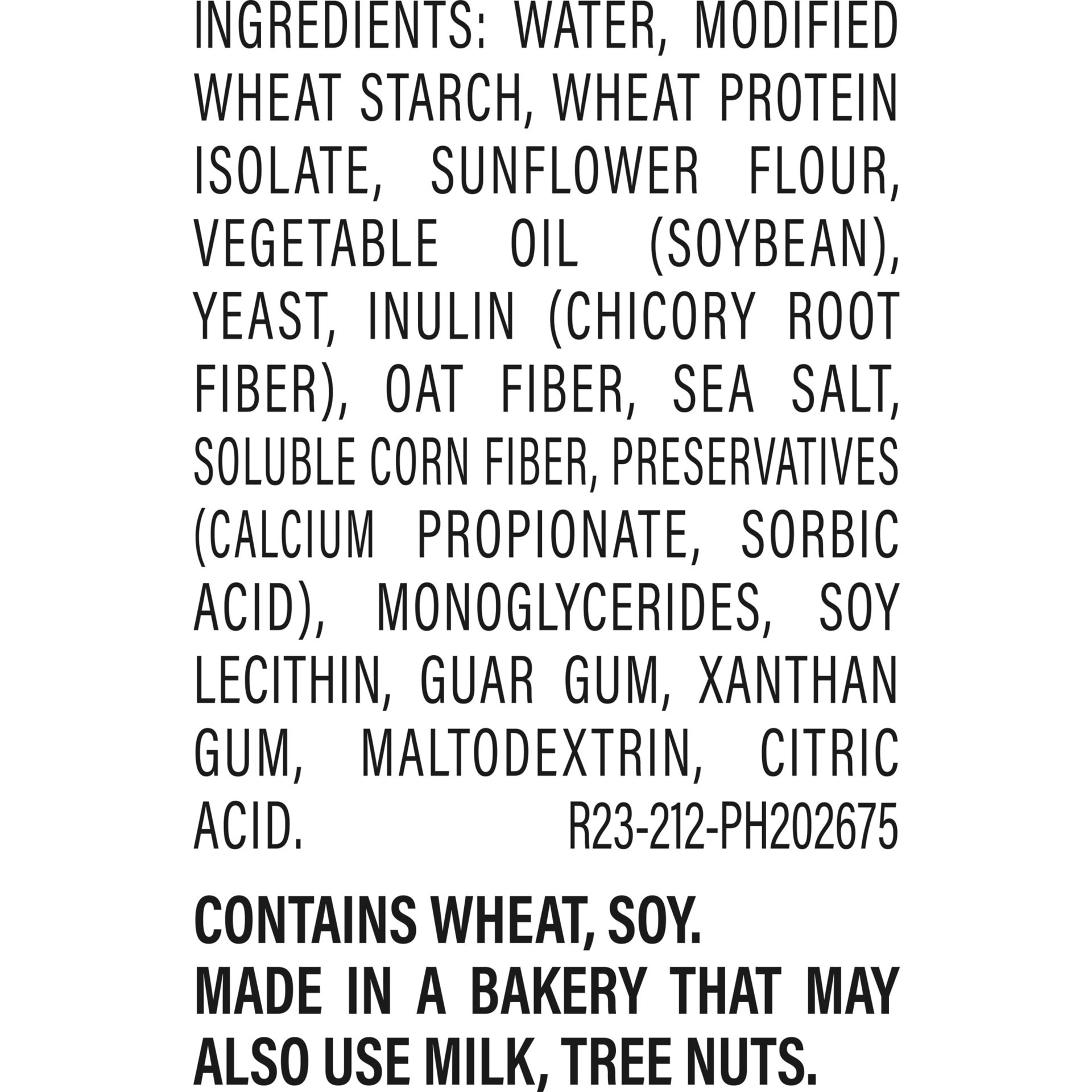 Water, Modified Wheat Starch, Wheat Protein Isolate, Sunflower Flour, Vegetable Oil (Soybean), Yeast, Inulin (Chicory Root Fiber), Oat Fiber, Sea Salt, Soluble Corn Fiber, Preservatives [Calcium Propi…