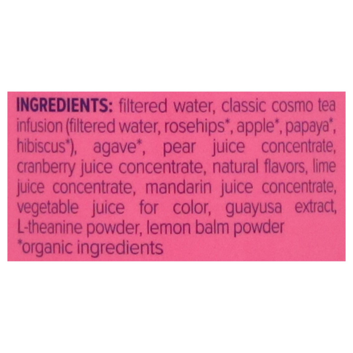 Filtered Water, Classic Cosmo Tea Infusion (Filtered Water, Rosehips*, Apple*, Papaya*, Hibiscus*), Agave*, Pear Juice Concentrate, Cranberry Juice Concentrate, Natural Flavors, Lime Juice Concentrate…