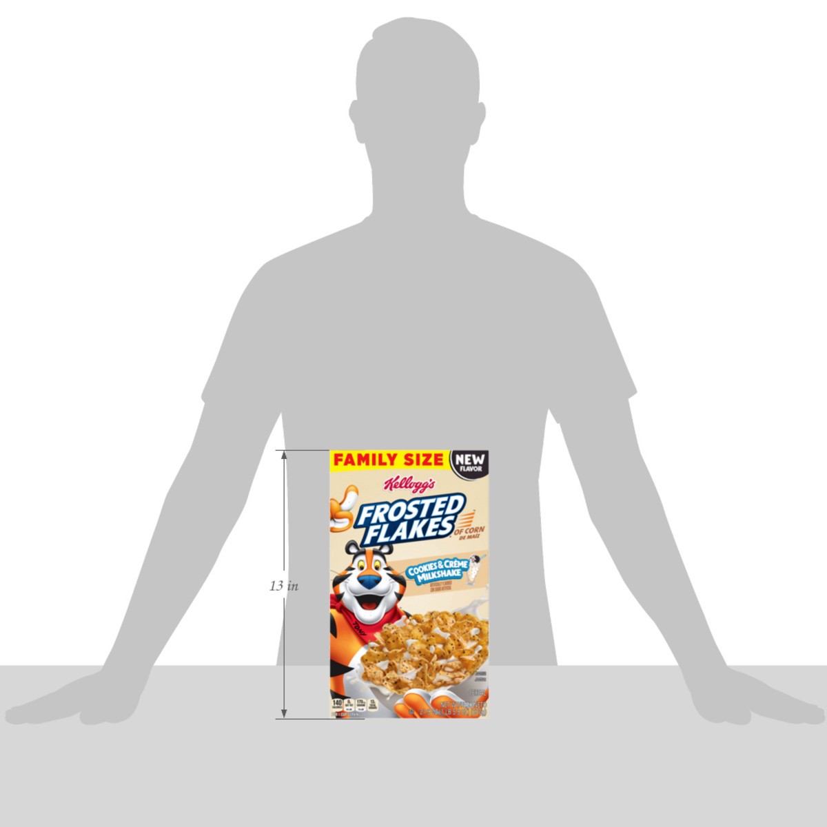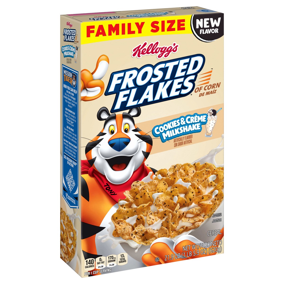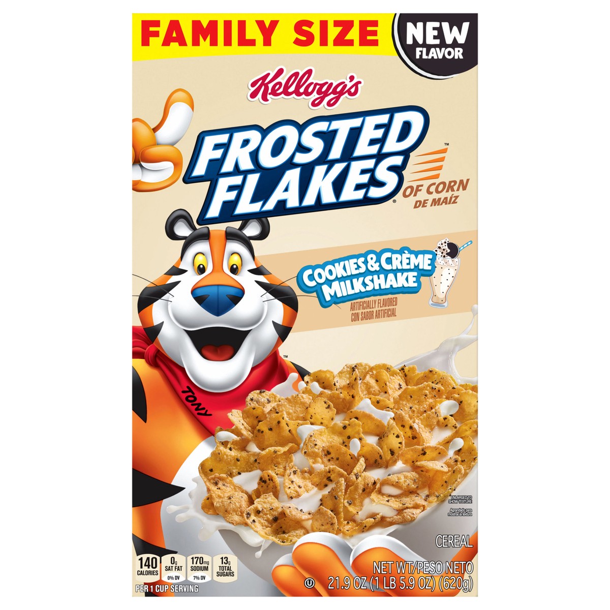 - 21.9oz family-size box of Kellogg's Frosted Flakes Cookies and Creme Milkshake ready-to-eat cereal; Packaged for freshness and great taste