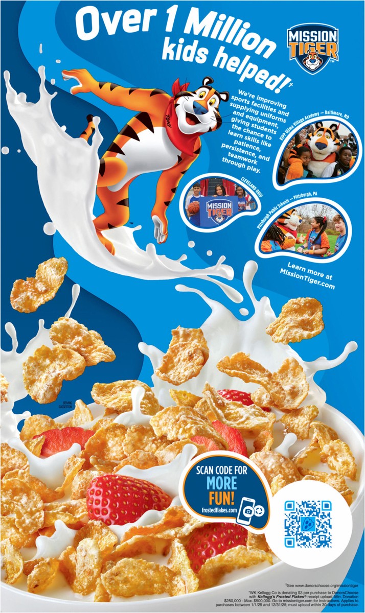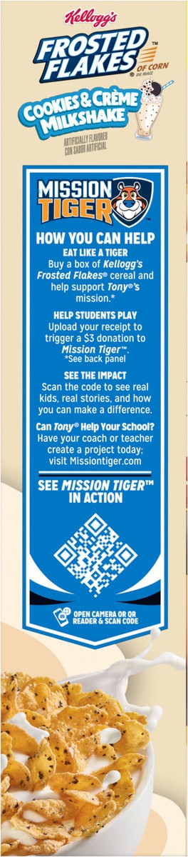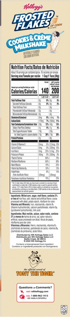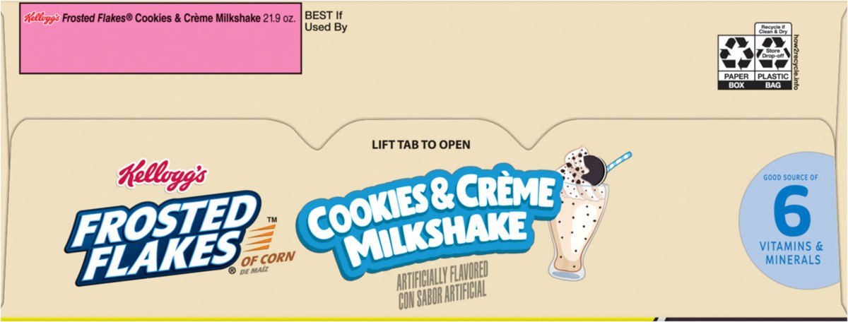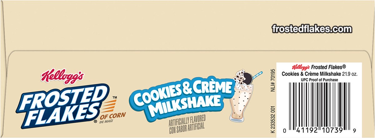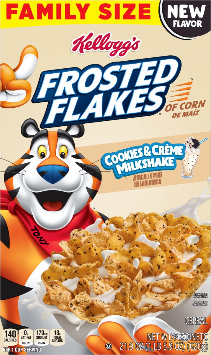 - 21.9oz family-size box of Kellogg's Frosted Flakes Cookies and Creme Milkshake ready-to-eat cereal; Packaged for freshness and great taste