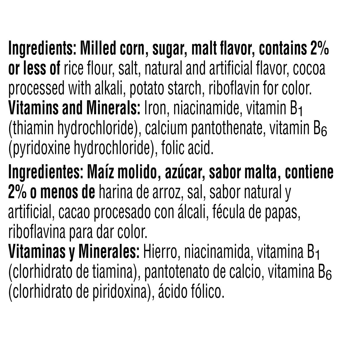 Milled Corn, Sugar, Malt Flavor, Contains 2% or Less of Rice Flour, Salt, Natural and Artificial Flavor, Cocoa Processed with Alkali, Potato Starch, Riboflavin for Color. Vitamins and Minerals: Iron, …
