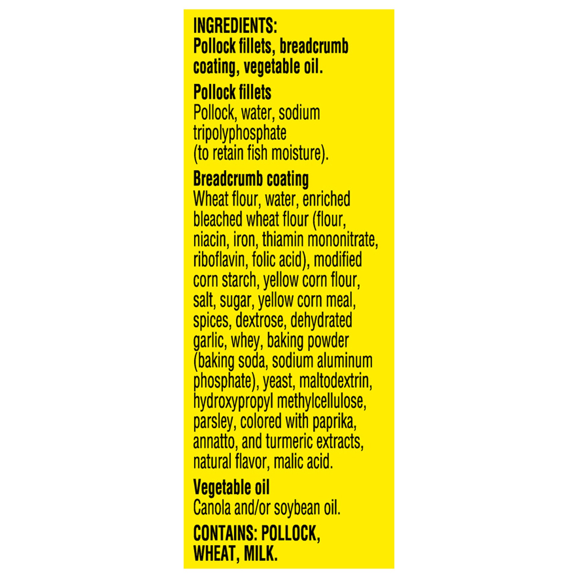 Pollock (Pollock, Water, Sodium Tripolyphosphate (to retain fish moisture), Breadcrumb Coating (Wheat Flour, Water, Enriched bleached wheat flour (Flour, Niacin, Iron, Thiamin Mononitrate, Riboflavin,…
