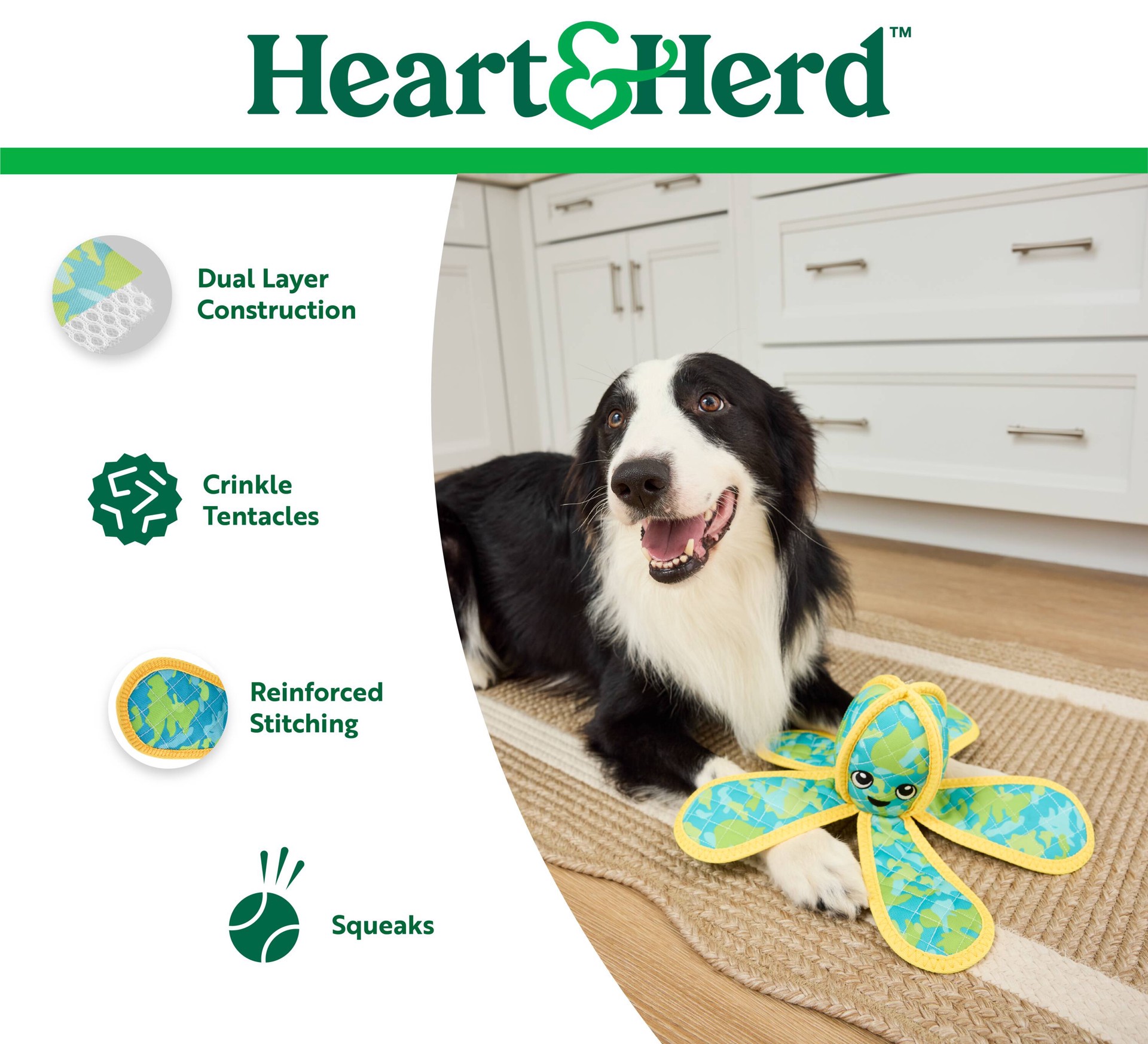 Heart & Herd Octopus dog toy is great for fetch, cuddles, and entertainment.. Packed with fun – an exciting squeaker in the head and irresistible crinkle paper in the legs for maximum enjoyment.. Cont…