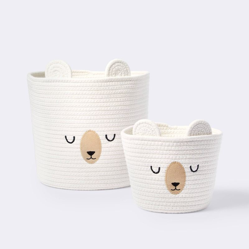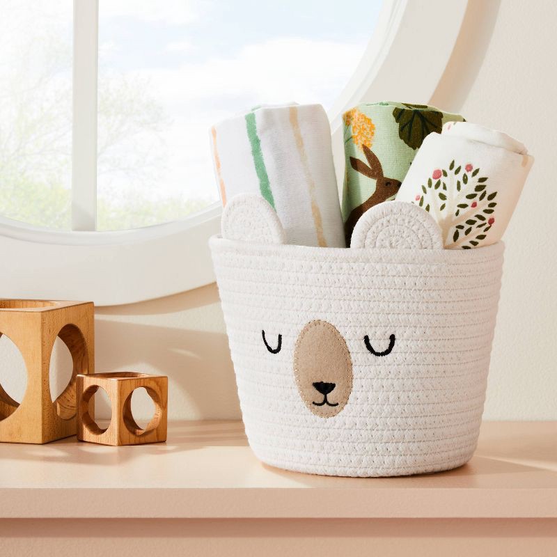 Keep your kid's space mess-free when you add this Small Tapered Round Coiled Rope Sleepy Bear Round Basket from cloud island™. Beautifully woven from cotton material, this small tapered basket comes i…
