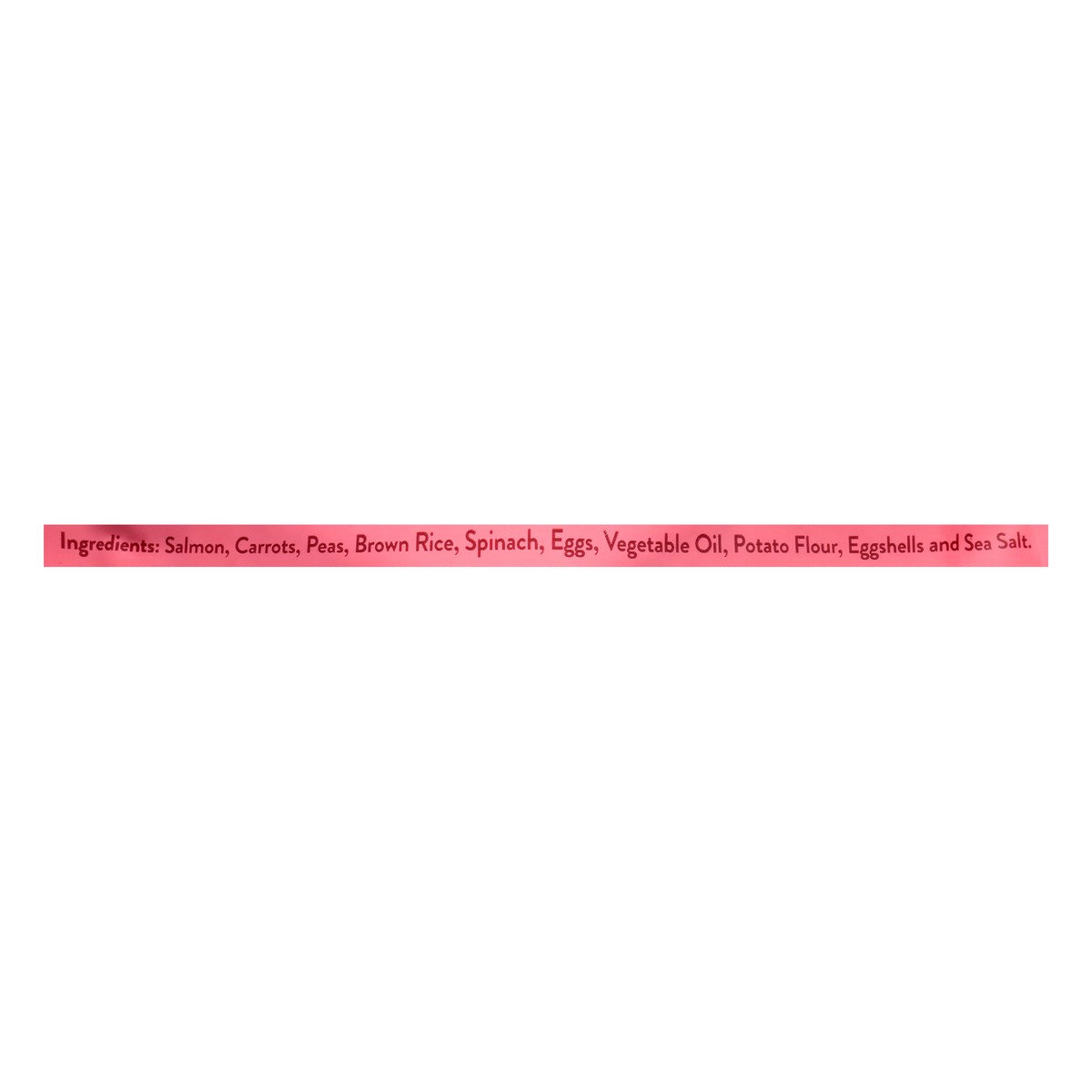 Salmon, Carrots, Peas, Brown Rice, Spinach, Eggs, Vegetable Oil, Potato Flour, Eggshells and Sea Salt.