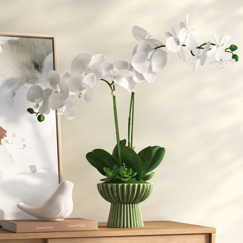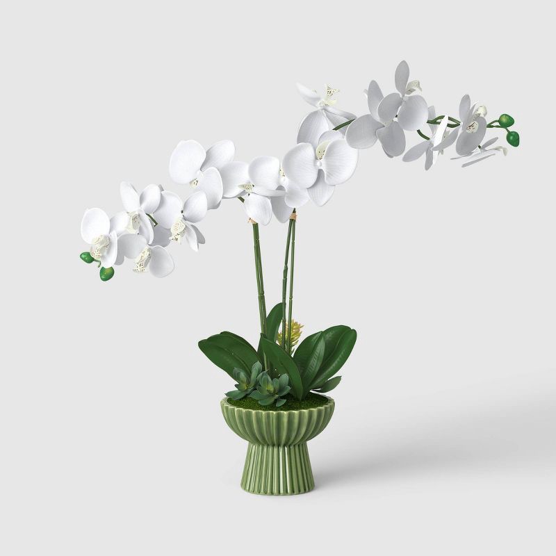 Add effortless greenery to your interiors with this Elevated Orchid Plant from Threshold™. This artificial plant features white orchid flowers and green leaves with green succulents near the base for …