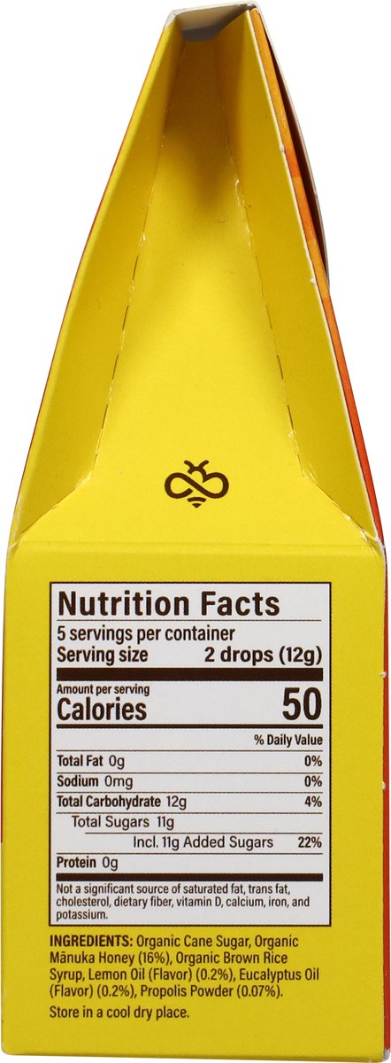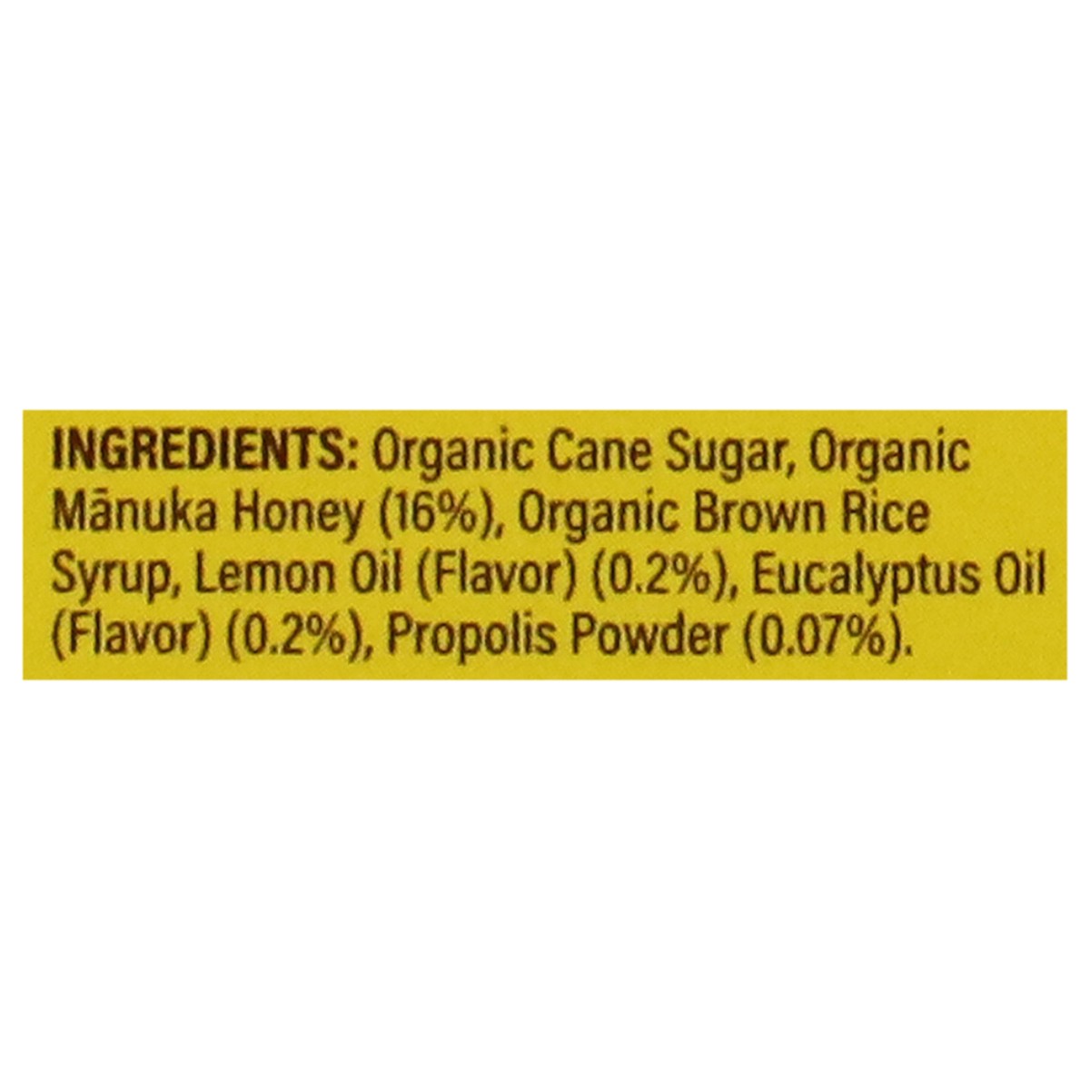 Organic Cane Sugar, Organic Manuka Honey (16%), Organic Brown Rice Syrup, Lemon Oil (Flavor) (0.2%), Eucalyptus Oil (Flavor) (0.2%), Propolis Powder (0.07%).