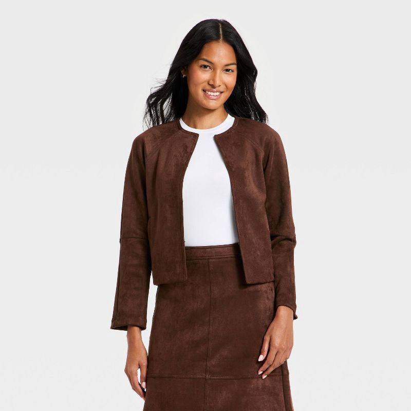 Elevate your outerwear collection with this Faux-Suede Jacket from A New Day™. Crafted from recycled polyester fabric with spandex, this midweight jacket showcases a rich faux-suede finish in a versat…