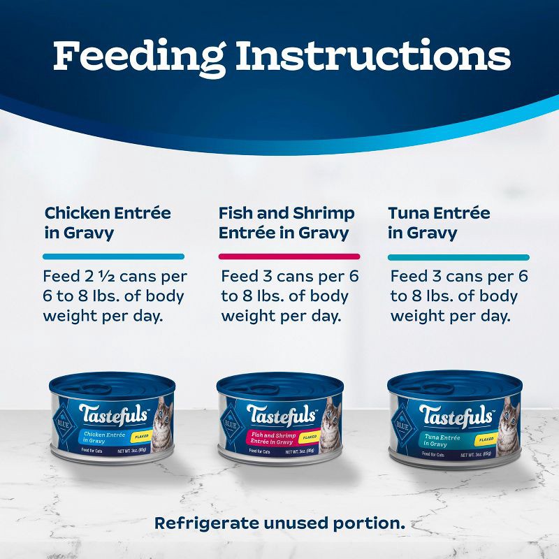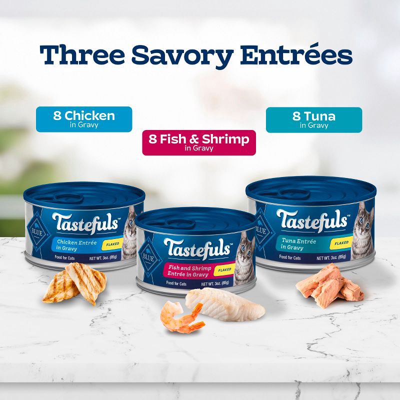 - Contains: Four (4) 3-oz cans of BLUE Tastefuls Natural Flaked Wet Cat Food, Tuna; four (4) 3-oz cans of BLUE Tastefuls Natural Flaked Wet Cat Food, Chicken; and four (4) 3-oz cans of BLUE Tastefuls Natural Flaked Wet Cat Food, Fish & Shrimp