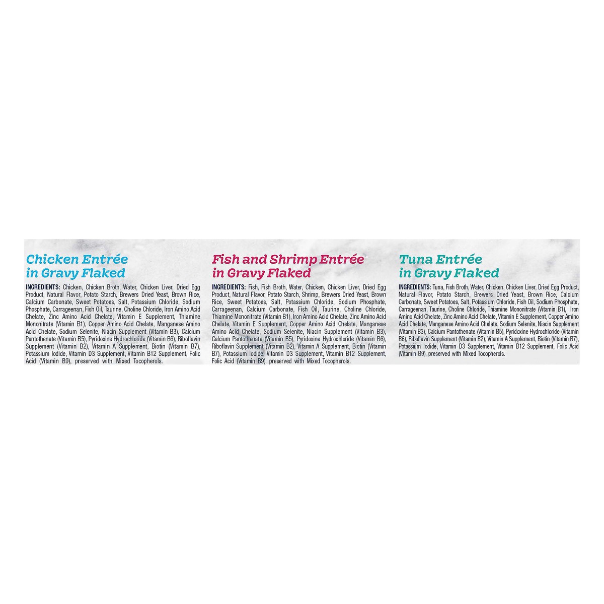 Chicken Entree in Gravy Flaked: Chicken, Chicken Broth, Water, Chicken Liver, Dried Egg Product, Natural flavor, Potato Starch, Brewers Dried Yeast, Brown Rice, Calcium Carbonate, Sweet Potatoes, Salt…