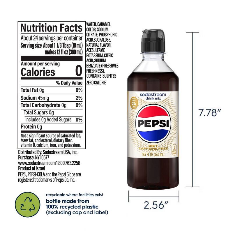 - Includes: (1) 440ml Sodastream® Diet Caffeine Free Pepsi® Drink Mix bottles