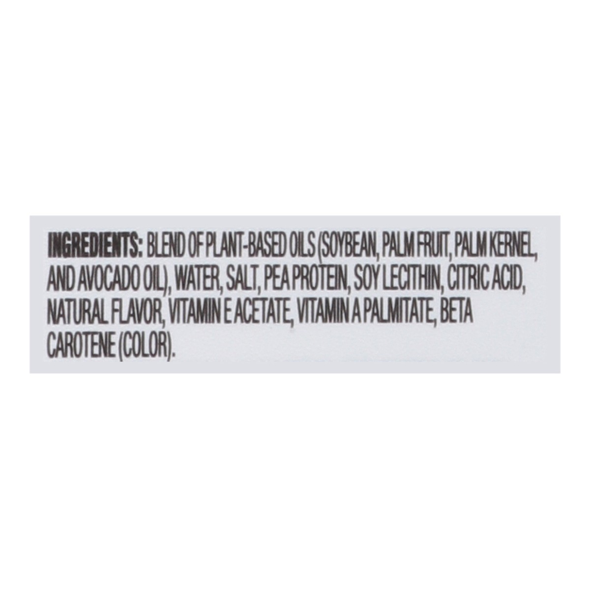 Blend of Plant-Based Oils (Soybean, Palm Fruit, Palm Kernel, and Avocado Oil), Water, Salt, Pea Protein, Soy Lecithin, Citric Acid, Natural Flavor, Vitamin E Acetate, Vitamin A Palmitate, Beta Caroten…