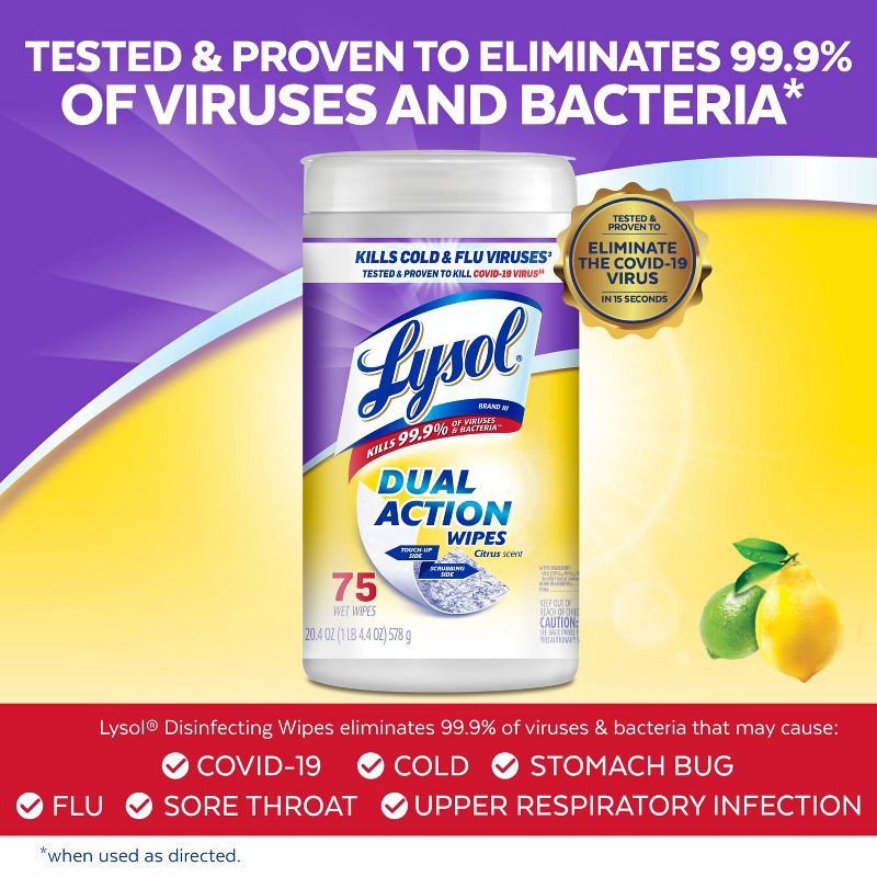 - DISINFECTING SCRUBBING WIPES KILLS 99.9% OF VIRUSES AND BACTERIA: Lysol Dual Action Disinfecting Wipes are tested and proven to kill 99.9% of viruses and bacteria, including 8 cold and flu viruses.* (Use as directed).