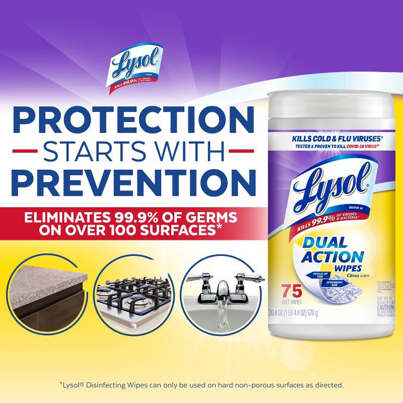 - DOUBLE SIDED CLEANING WIPES FOR TOUGH MESSES: Lysol Dual Action Disinfecting Wipes has one side with a scrubbing texture to clean tough messes, and one with a softer side for every day touch ups.