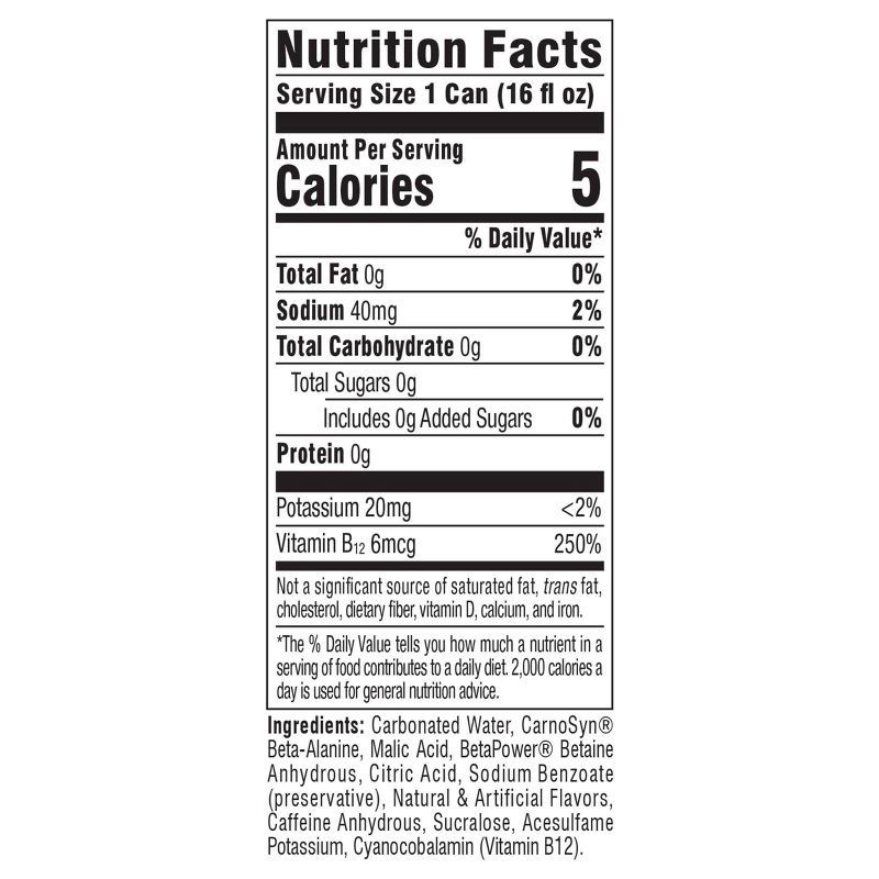 Carbonated Water, Carnosyn® Beta-Alanine, Malic Acid, Betapower® Betaine Anhydrous, Citric Acid, Sodium Benzoate (Preservative), Natural & Artificial Flavors, Caffeine Anhydrous, Sucralose, Acesulfame…