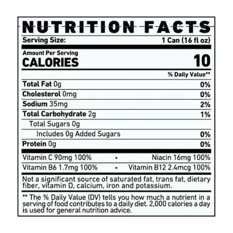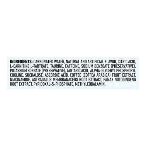Carbonated Water, Natural and Artificial Flavor, Citric Acid, L-Carnitine L-Tartrate, Taurine, Caffeine, Sodium Benzoate (Preservative), Potassium Sorbate (Preservative), Tartaric Acid, Alpha-Glyceryl…