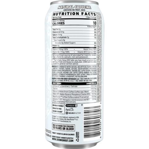 Smooth and fruity, meets balanced and juicy, with notes of bubble gum Natural & artificial flavors 0 sugar per can 0 fat per can Ghost Energy is low in calories Zero sugar Vegan friendly Gluten free G…