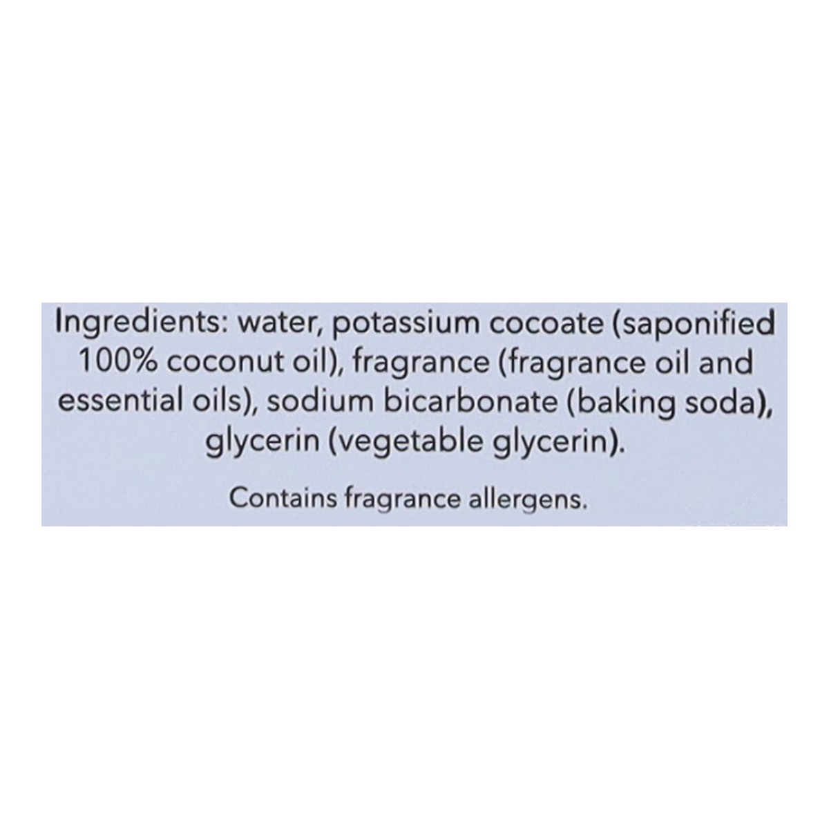 Water, Potassium Cocoate (Saponified 100% Coconut Oil), Fragrance (Fragrance Oil and Essential Oils), Sodium Bicarbonate (Baking Soda), Glycerin (Vegetable Glycerin).