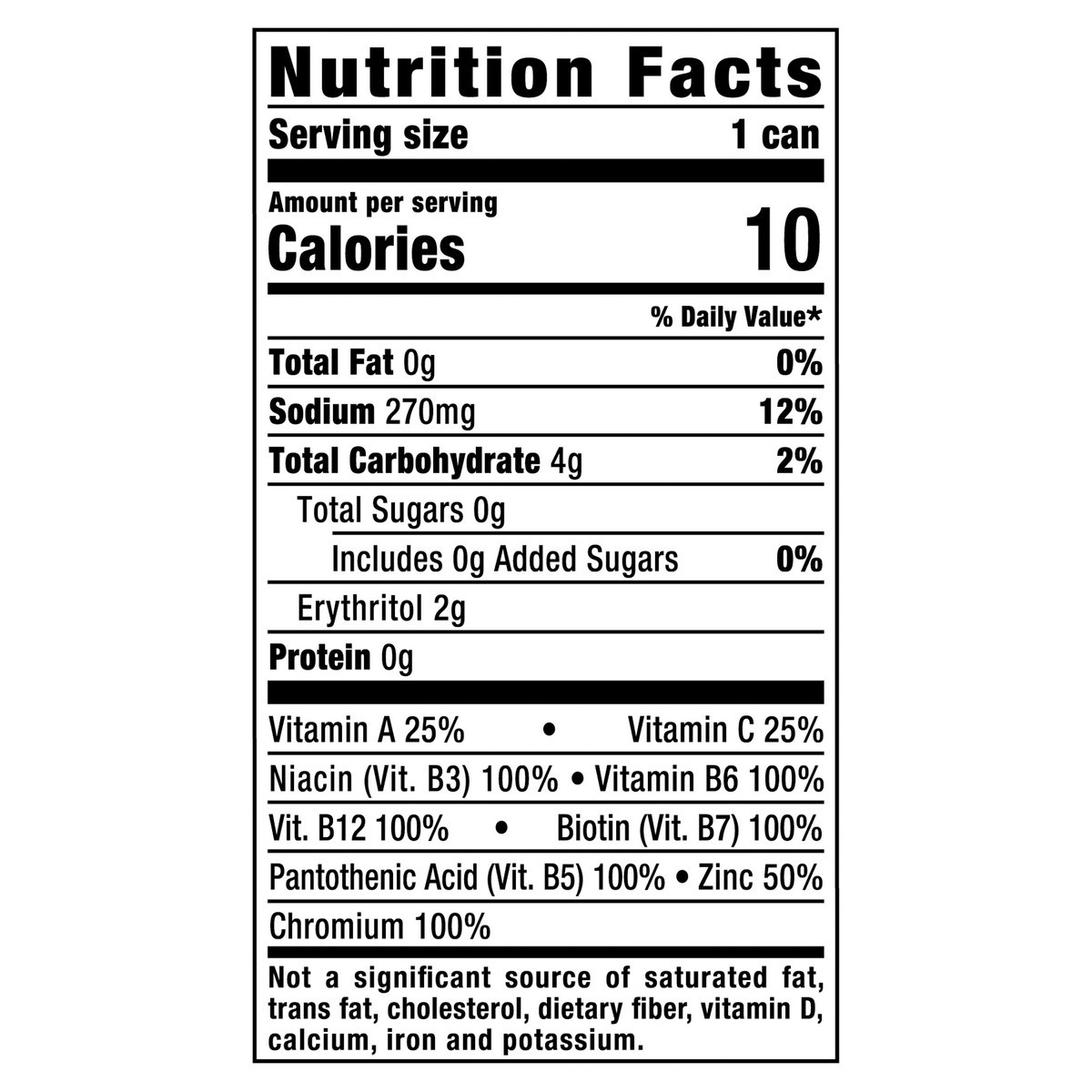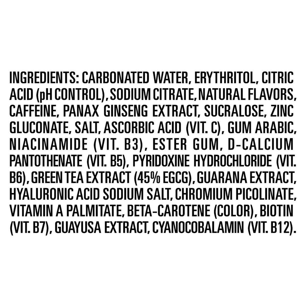 Carbonated Water, Erythritol, Citric Acid (pH Control), Sodium Citrate, Natural Flavors, Caffeine, Panax Ginseng Extract, Sucralose, Zinc Gluconate, Salt, Ascorbic Acid (Vit. C), Gum Arabic, Niacinami…