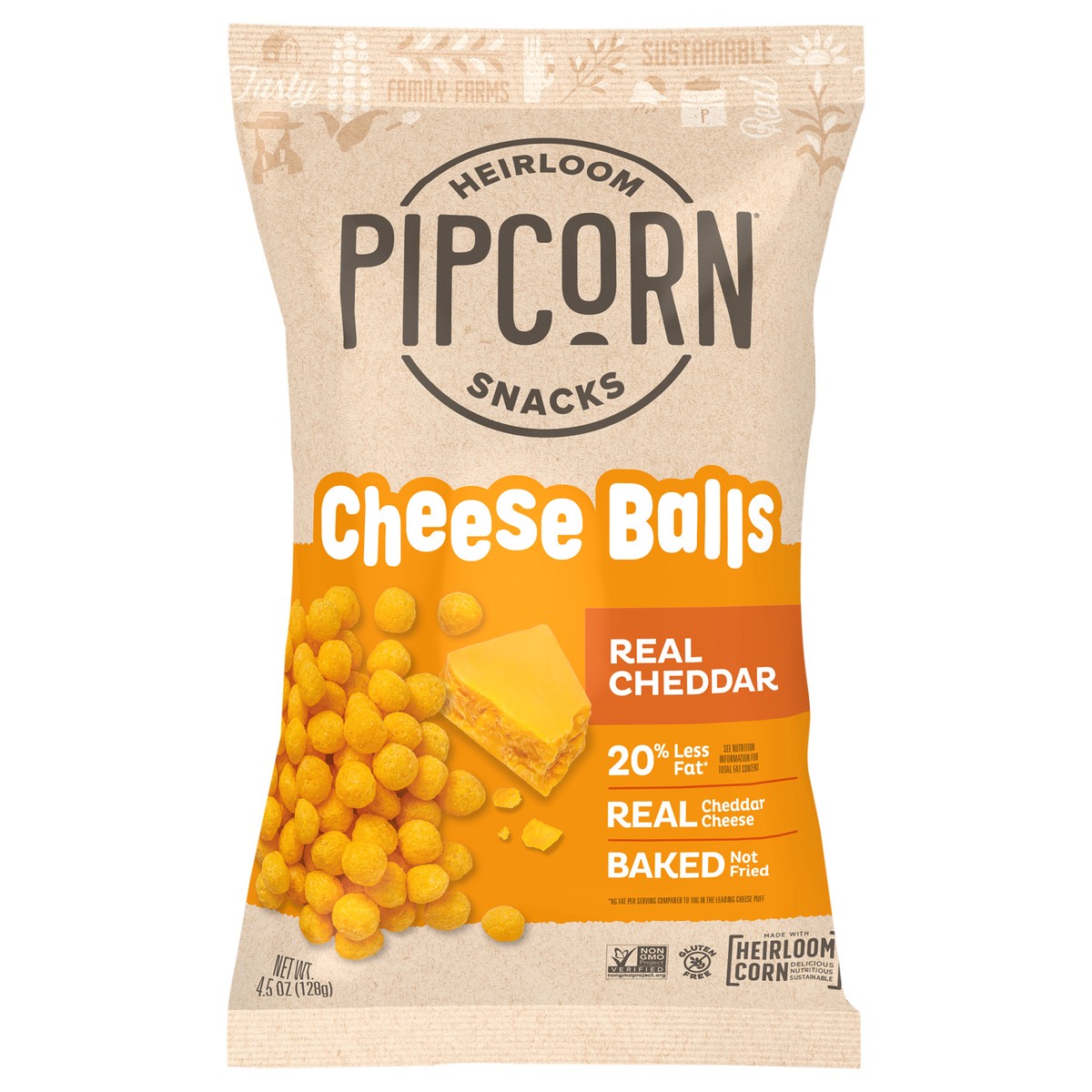 Gluten free. 20% less fat (8 g fat per serving compared to 10 g in the leading cheese puff). See nutrition information for total fat content. Non GMO Project verified. nongmoproject.org. Heirloom snac…