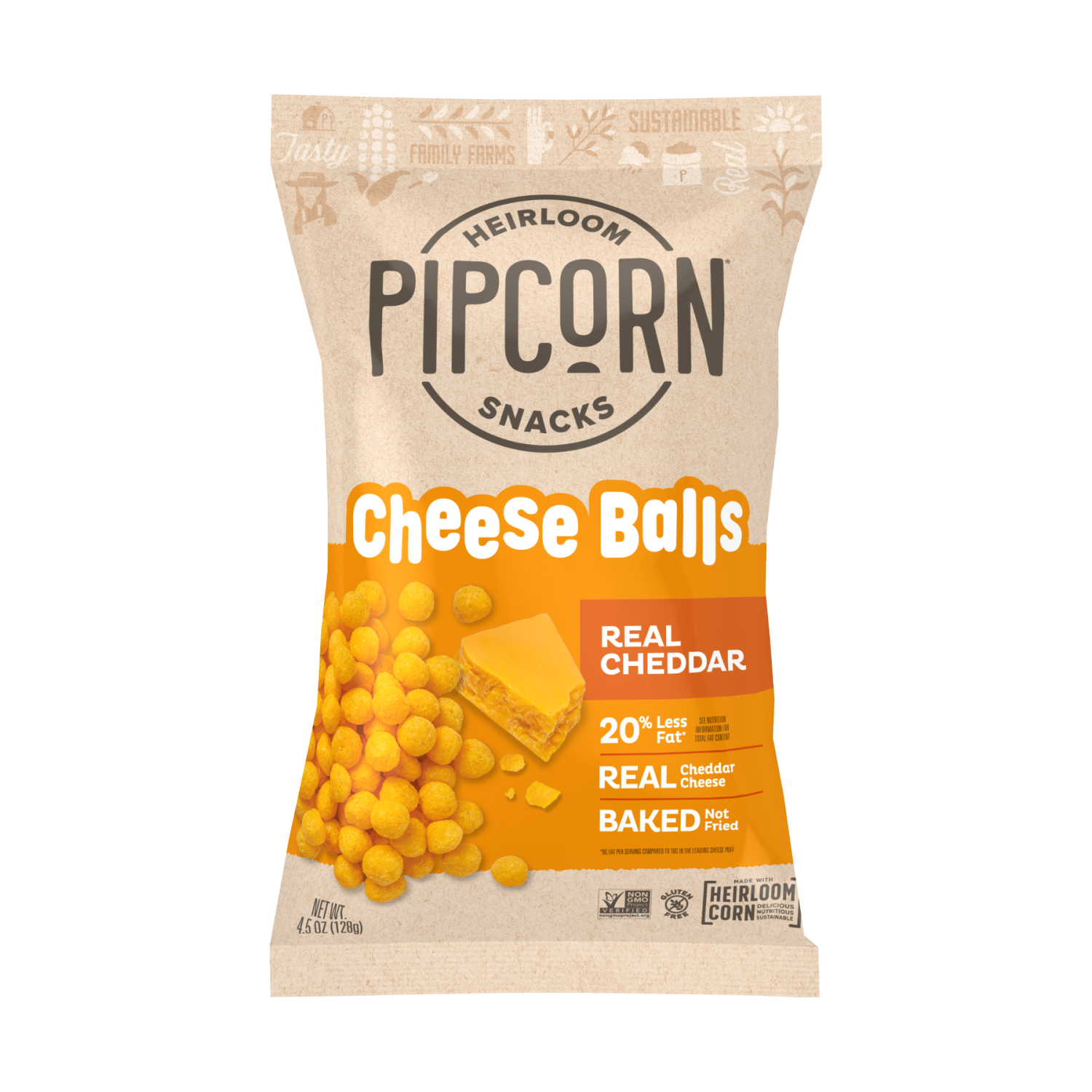 Gluten free. 20% less fat (8 g fat per serving compared to 10 g in the leading cheese puff). See nutrition information for total fat content. Non GMO Project verified. nongmoproject.org. Heirloom snac…
