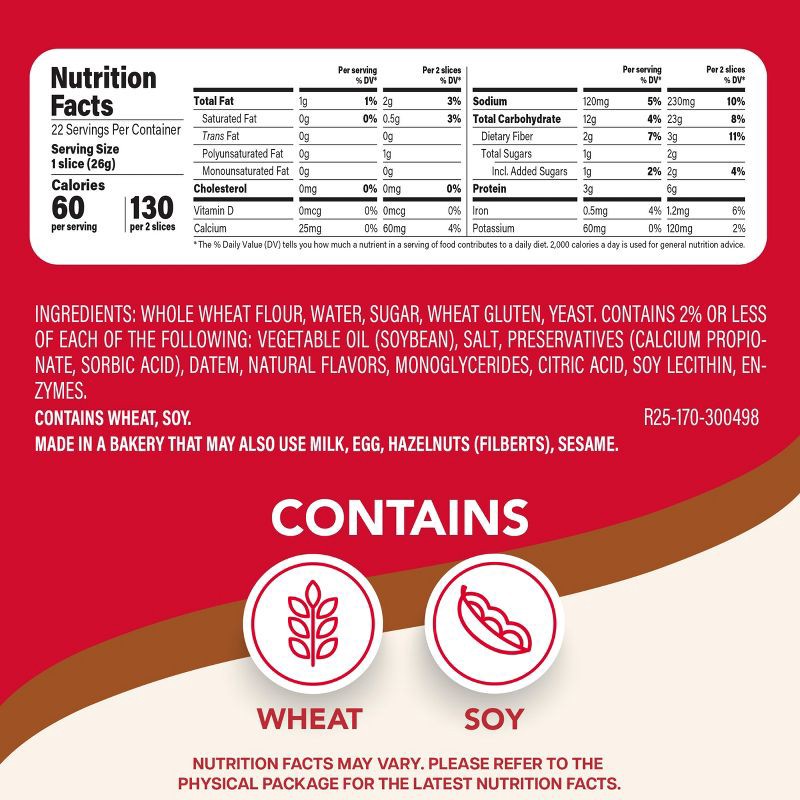 Whole Wheat Flour, Water, Sugar, Wheat Gluten, Yeast, Contains 2% or Less of Each of the Following: Vegetable Oil (Soybean), Salt, Preservatives (Calcium Propionate, Sorbic Acid), DATEM, Natural Flavo…