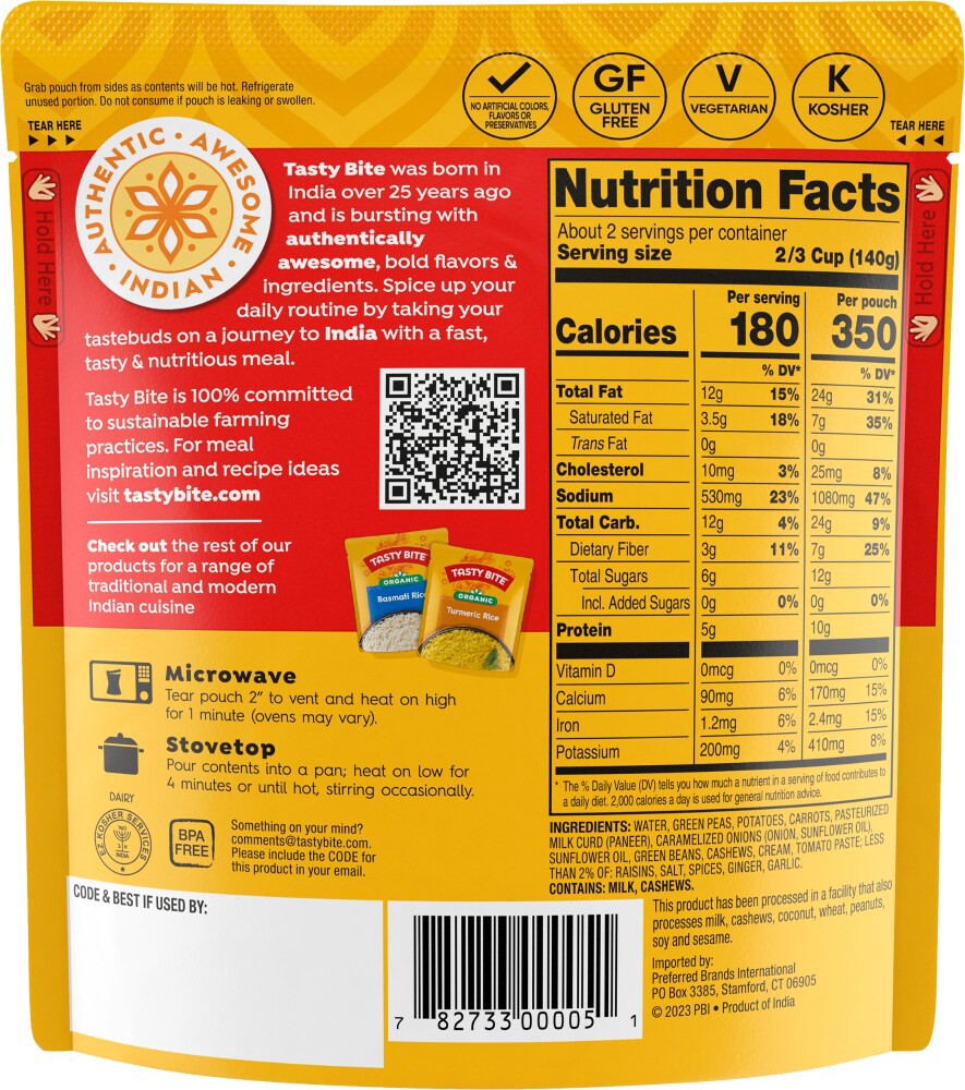 Water, Green Peas, Potatoes, Carrots, Pasteurized Milk Curd (Paneer), Caramelized Onions (Onion, Sunflower Oil), Sunflower Oil, Green Beans, Cashews, Cream, Tomato Paste; Less than 2% of: Raisins, Sal…